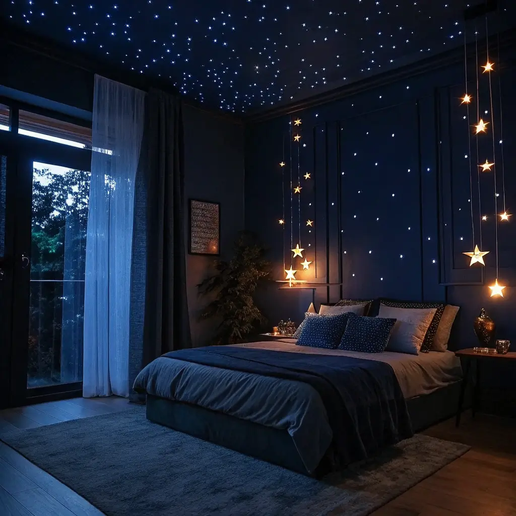 You don’t need to paint actual stars on your ceiling (though that’s an option). Instead, evoke the night sky through: