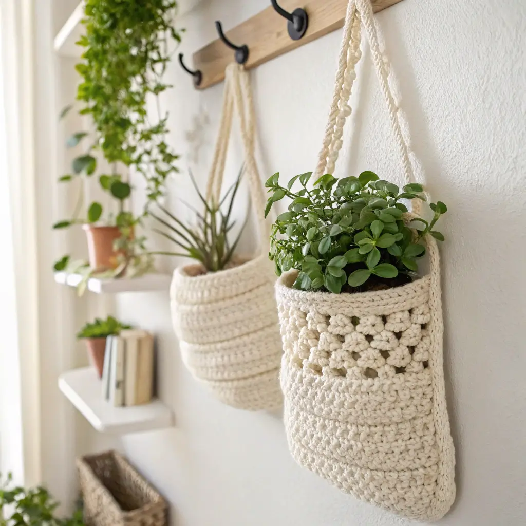 Combining plants with crochet? Genius move. Wall pocket planters give you vertical garden vibes without drilling a million holes in your wall (your landlord will thank you).