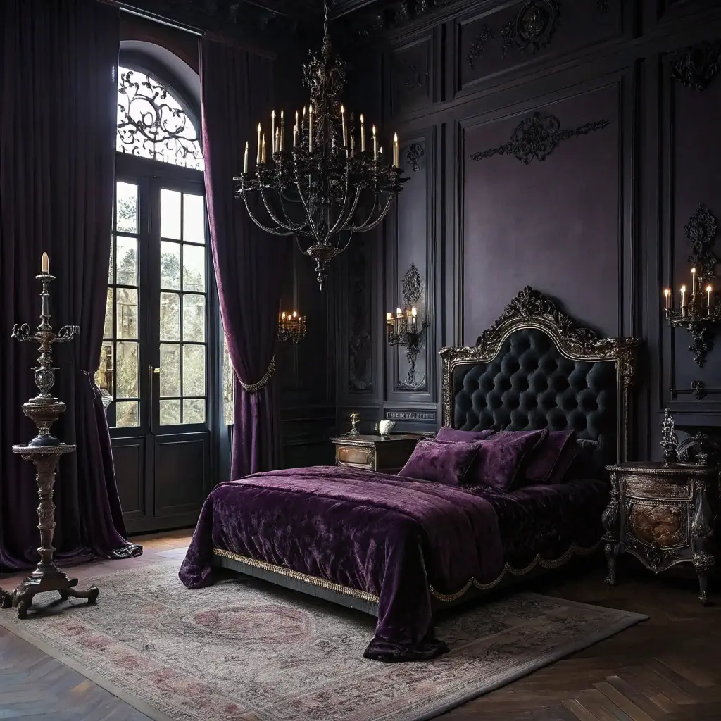 Think heavy velvet curtains that pool dramatically on the floor, ornate picture frames with dark finishes, and bedding that looks like it belongs in a centuries-old manor. Antique-inspired furniture works wonders here, especially pieces with carved details or wrought iron elements.