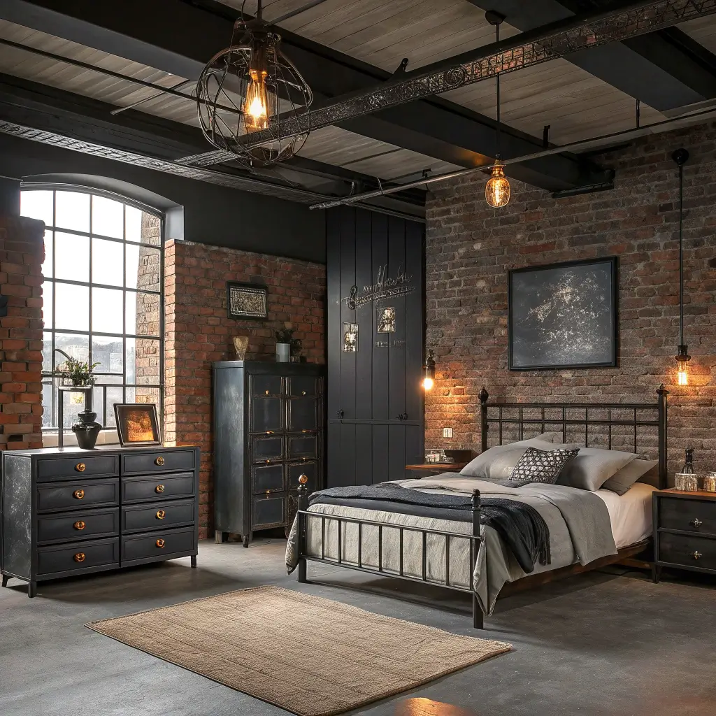 Industrial dark bedrooms celebrate exposed elements that other styles hide. Think brick walls (or brick wallpaper if you’re renting), exposed ductwork, concrete floors, and metal fixtures. The color palette naturally gravitates toward charcoal, black, rust tones, and weathered metals.