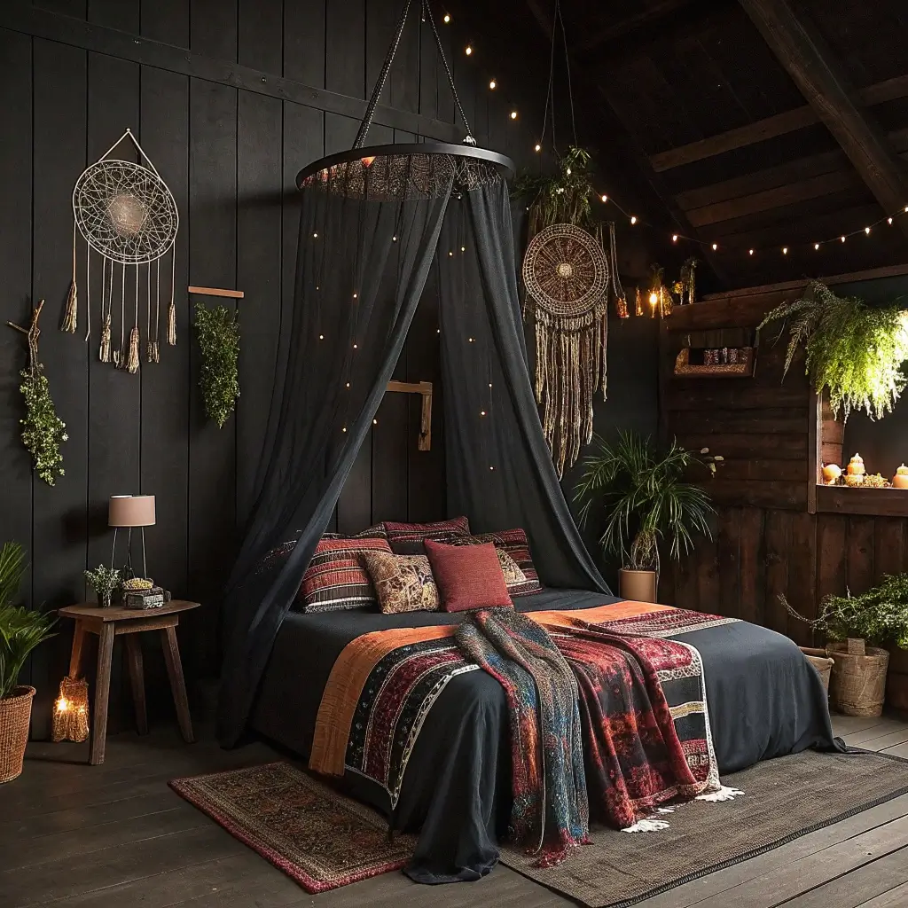 This aesthetic takes the layered, eclectic nature of bohemian design and grounds it with a dark, moody foundation. Think black or deep navy walls covered with collected art, hanging plants cascading from macramé holders, and textiles from around the world.