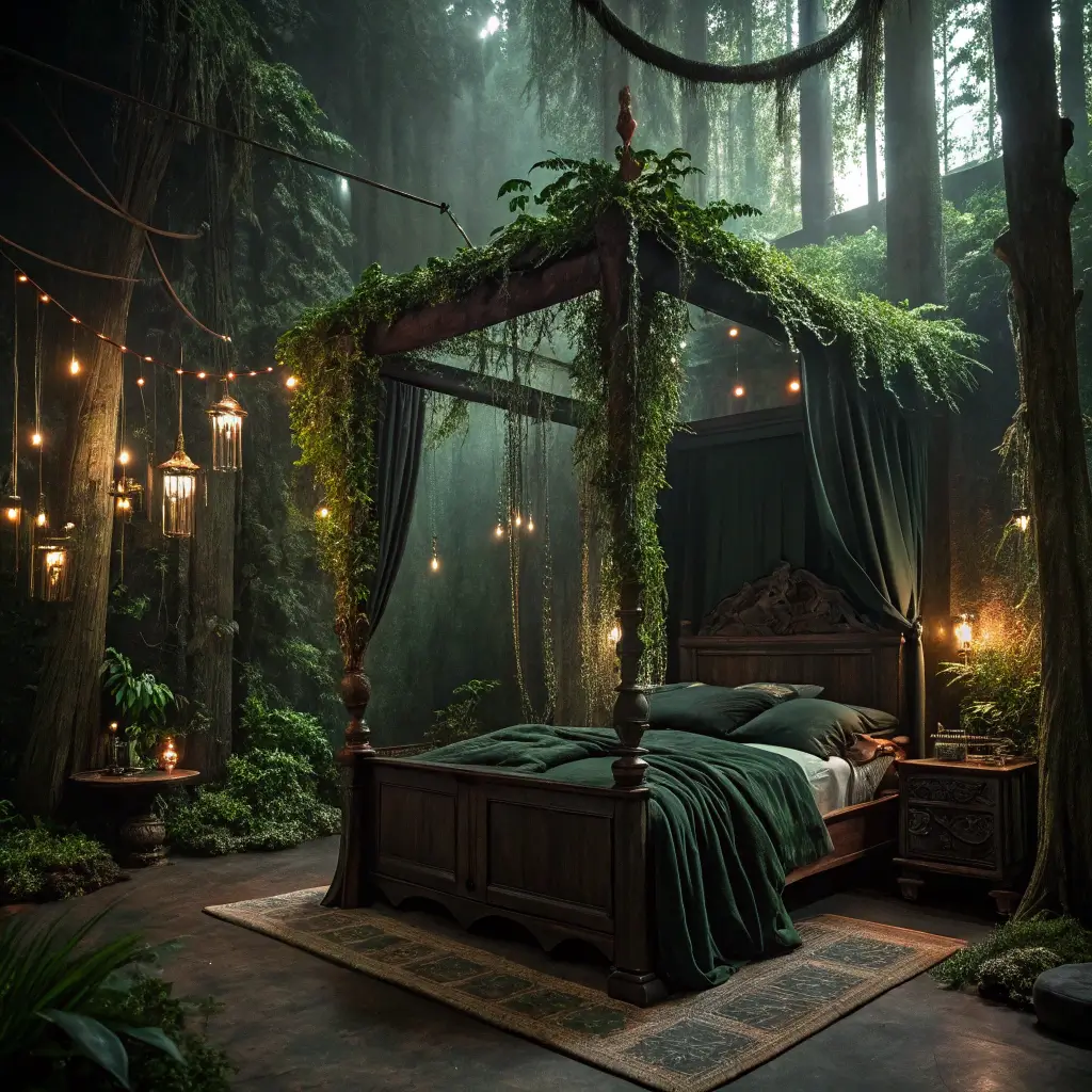The color palette draws directly from deep forests: dark greens, rich browns, touches of gold and amber, and plenty of black. It feels organic, mysterious, and deeply calming—like a bedroom designed by woodland creatures with excellent taste.
