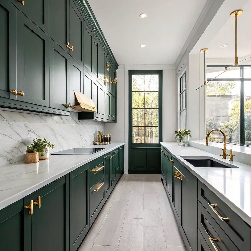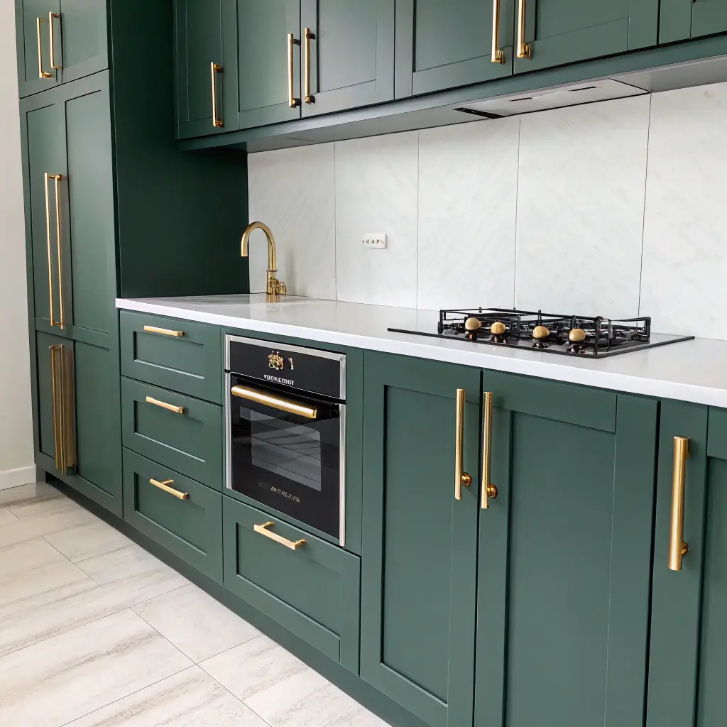 Classic meets contemporary with this timeless combination. Shaker-style cabinets in dark green feel both traditional and fresh, especially when you add those warm brass handles that practically glow against the deep color.