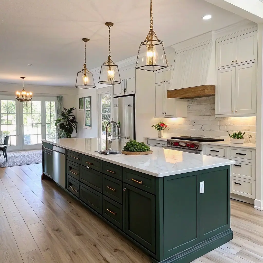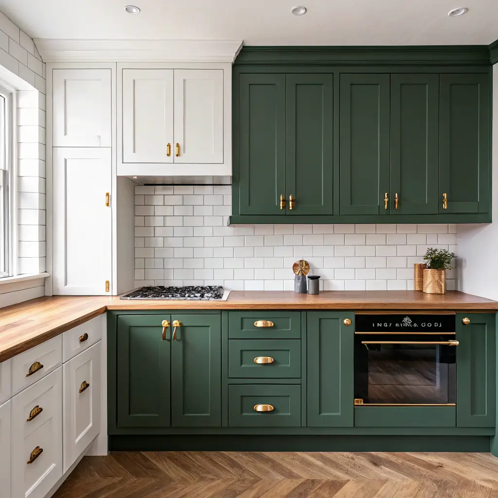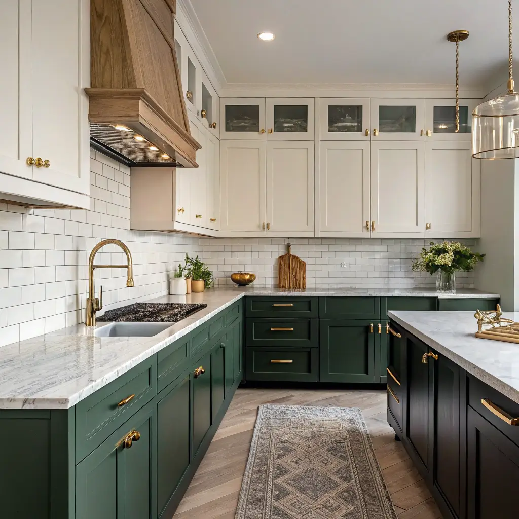 Why choose one color when two create magic? Two-tone kitchens featuring dark green lower cabinets and cream uppers offer the perfect compromise between bold and safe. This approach grounds the space while keeping things bright at eye level.