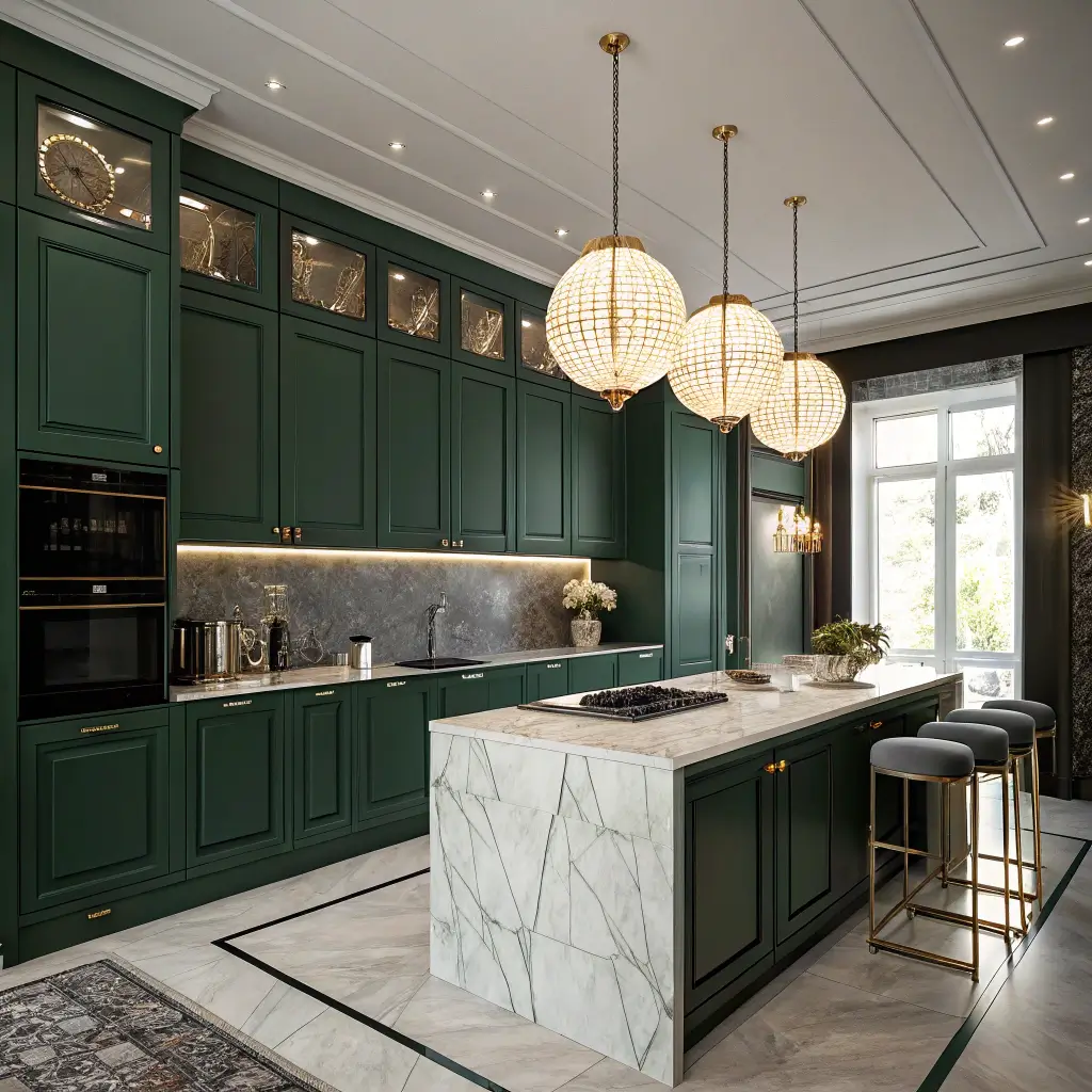 Here’s where things get really fun. Statement lighting transforms a dark green kitchen from beautiful to absolutely unforgettable. Those deep green surfaces become the perfect backdrop for show-stopping fixtures.