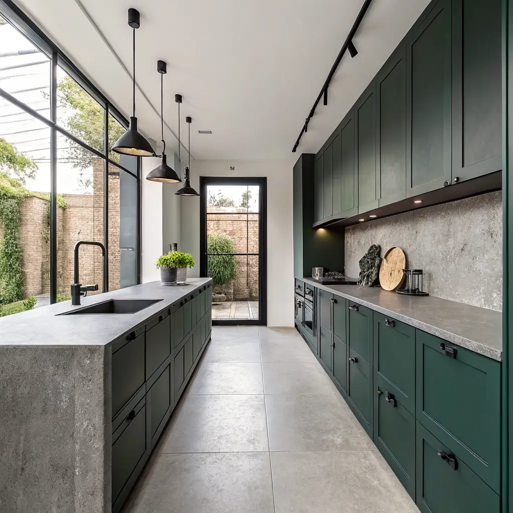 Industrial meets organic with this unexpectedly beautiful pairing. Concrete countertops bring raw texture that plays beautifully against refined dark green cabinets. This combination feels both rugged and sophisticated.