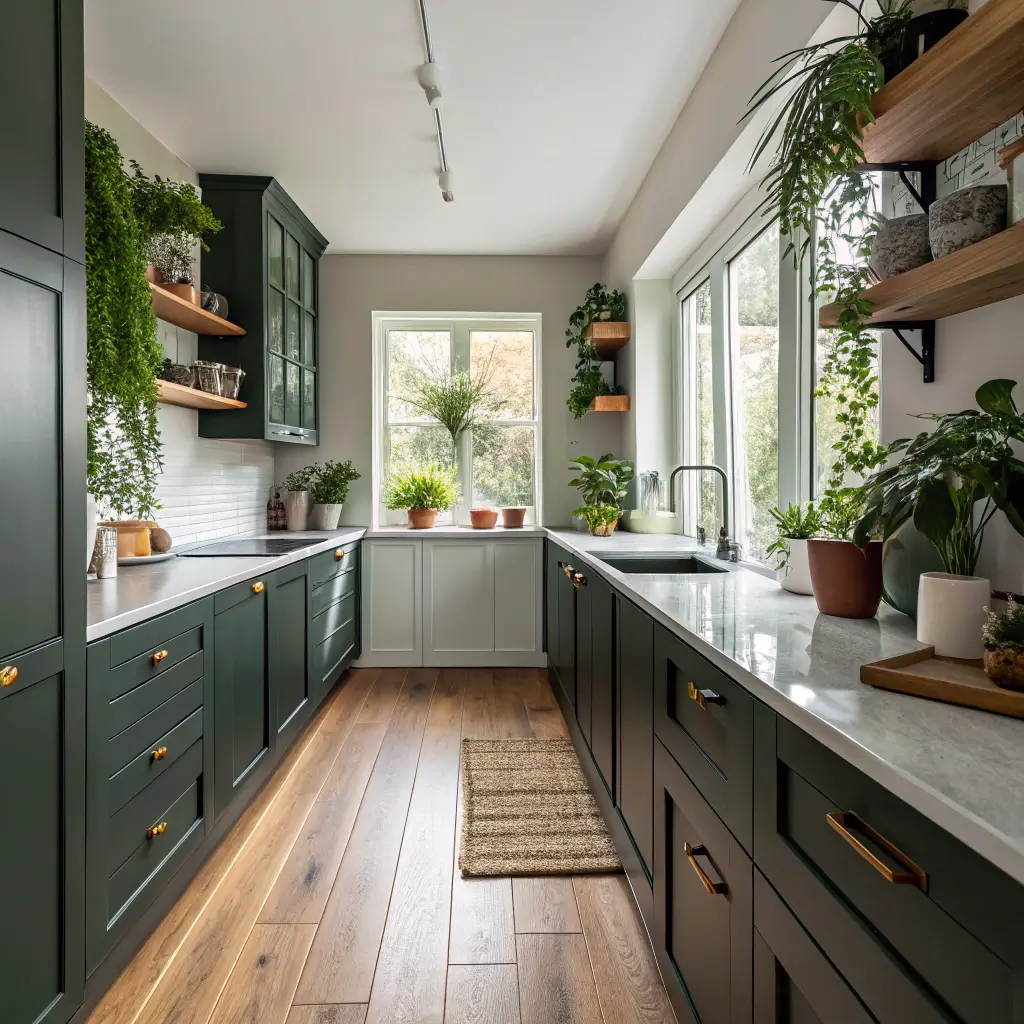 Bringing actual greenery into a dark green kitchen might seem redundant, but hear me out. Living plants against dark green cabinets create layers of color and texture that make the space feel alive and dynamic.