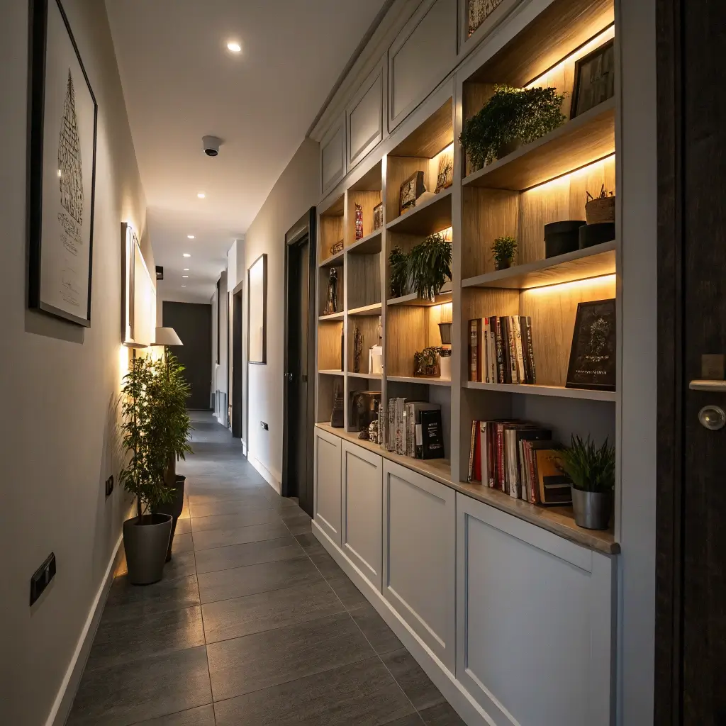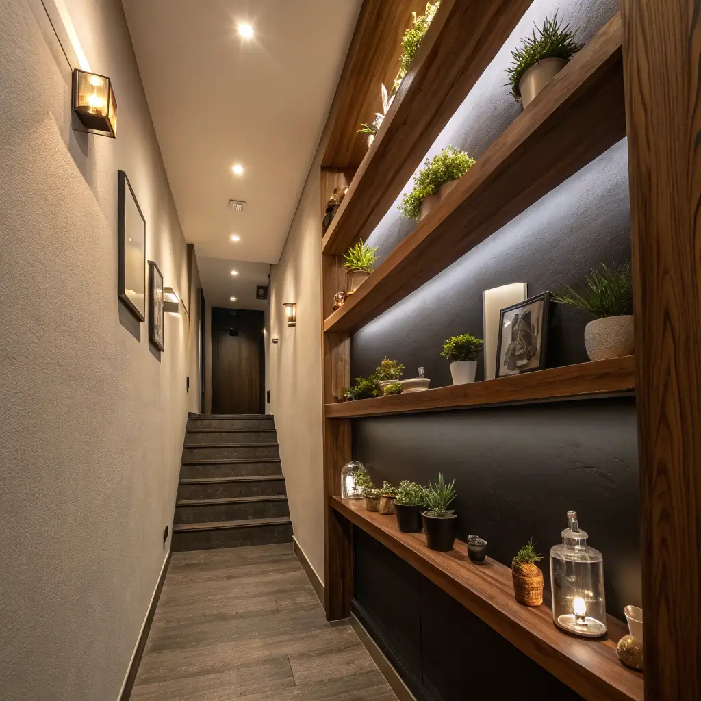 Floating shelves break up wall monotony while providing spots for light-enhancing decor. Small LED spotlights underneath shelves create pools of warm light that make hallways feel intentional, not forgotten.