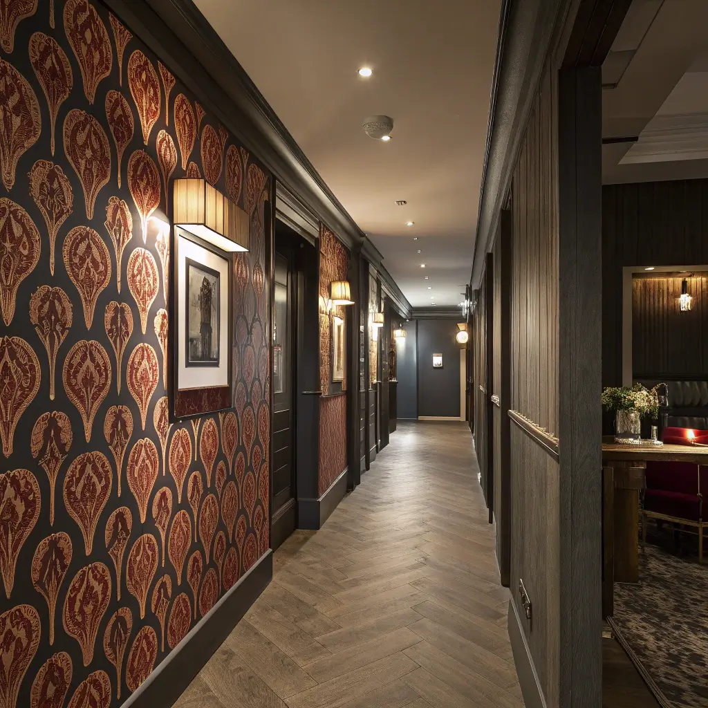 Wallpaper makes a comeback, and hallways provide perfect testing grounds for bold patterns. Light-colored wallpaper with metallic accents creates visual interest while enhancing brightness.