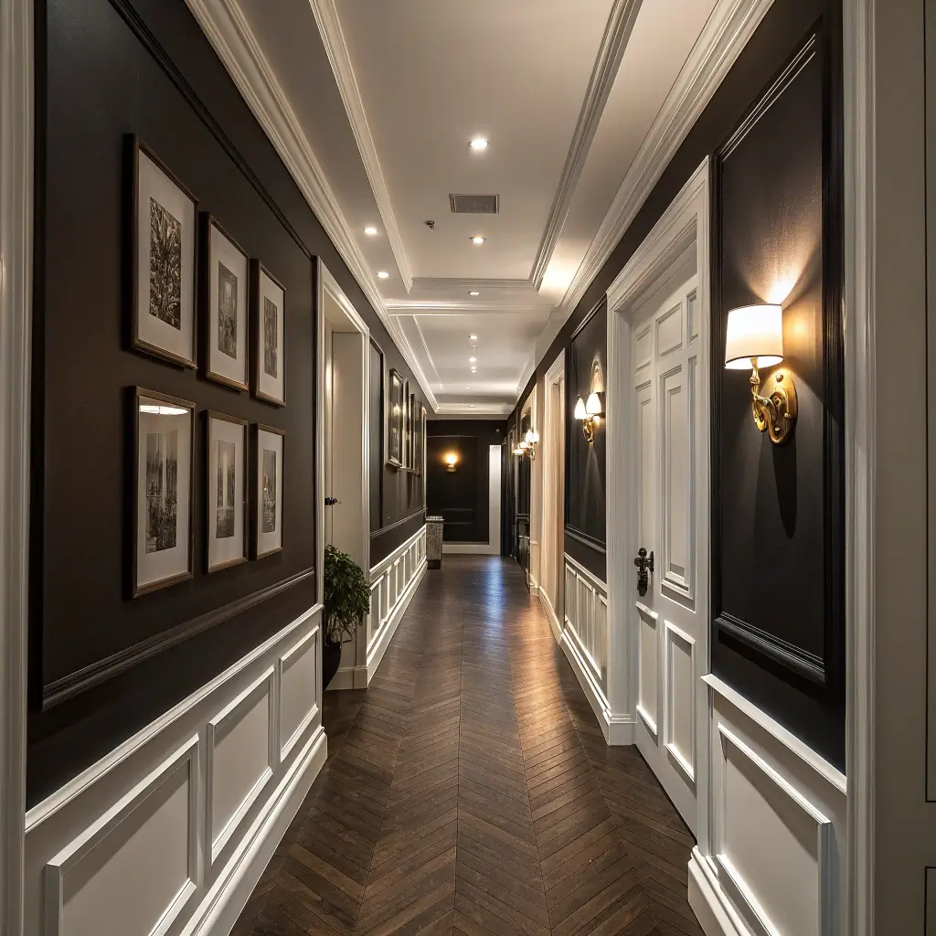 I painted my trim bright white against charcoal walls last spring. The contrast makes the hallway feel intentional and finished, not like an afterthought. The white reflects light from my fixtures, creating a subtle glow effect.