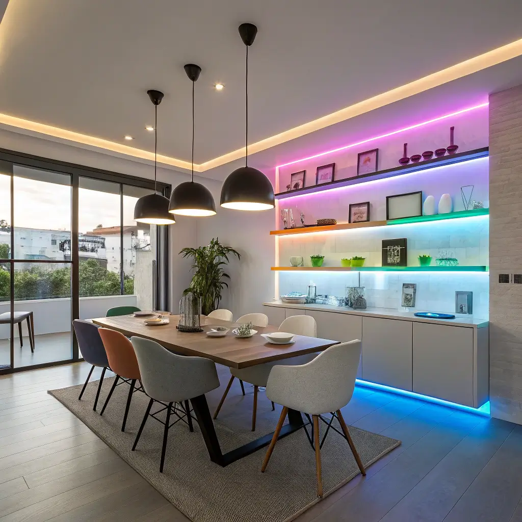 - Accent: LED strips behind floating shelves or artwork lights