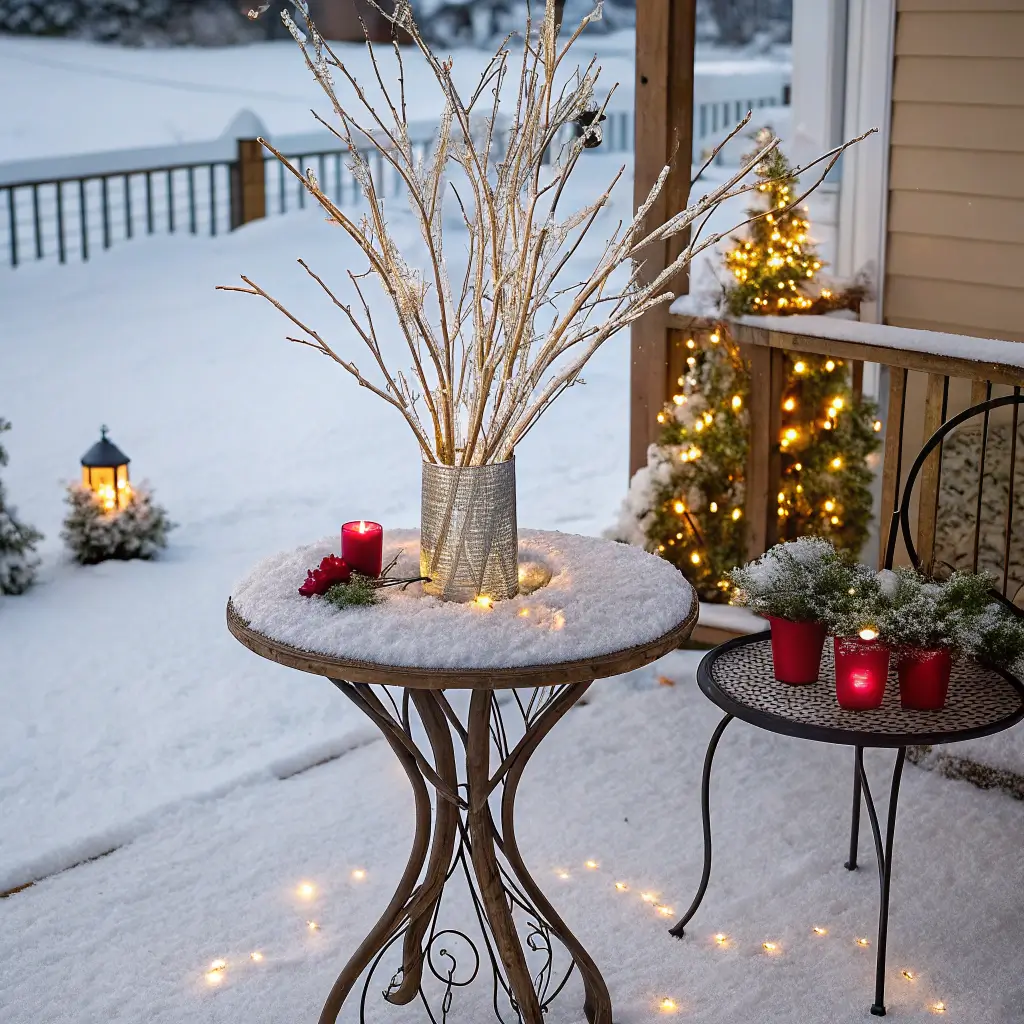 Spray painting branches with metallic paint, then adding glitter while wet, creates these ethereal, frost-kissed decorations. Arrange them in tall vases or buckets filled with sand for stability. The height draws the eye up and makes your outdoor space feel larger.