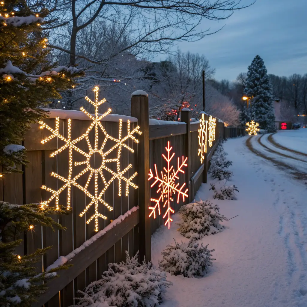 Rope lights bent into snowflake shapes create dramatic wall or fence decorations that look way more expensive than they are. I started making these after seeing similar ones at a holiday market for $75 each. Mine cost about $15.