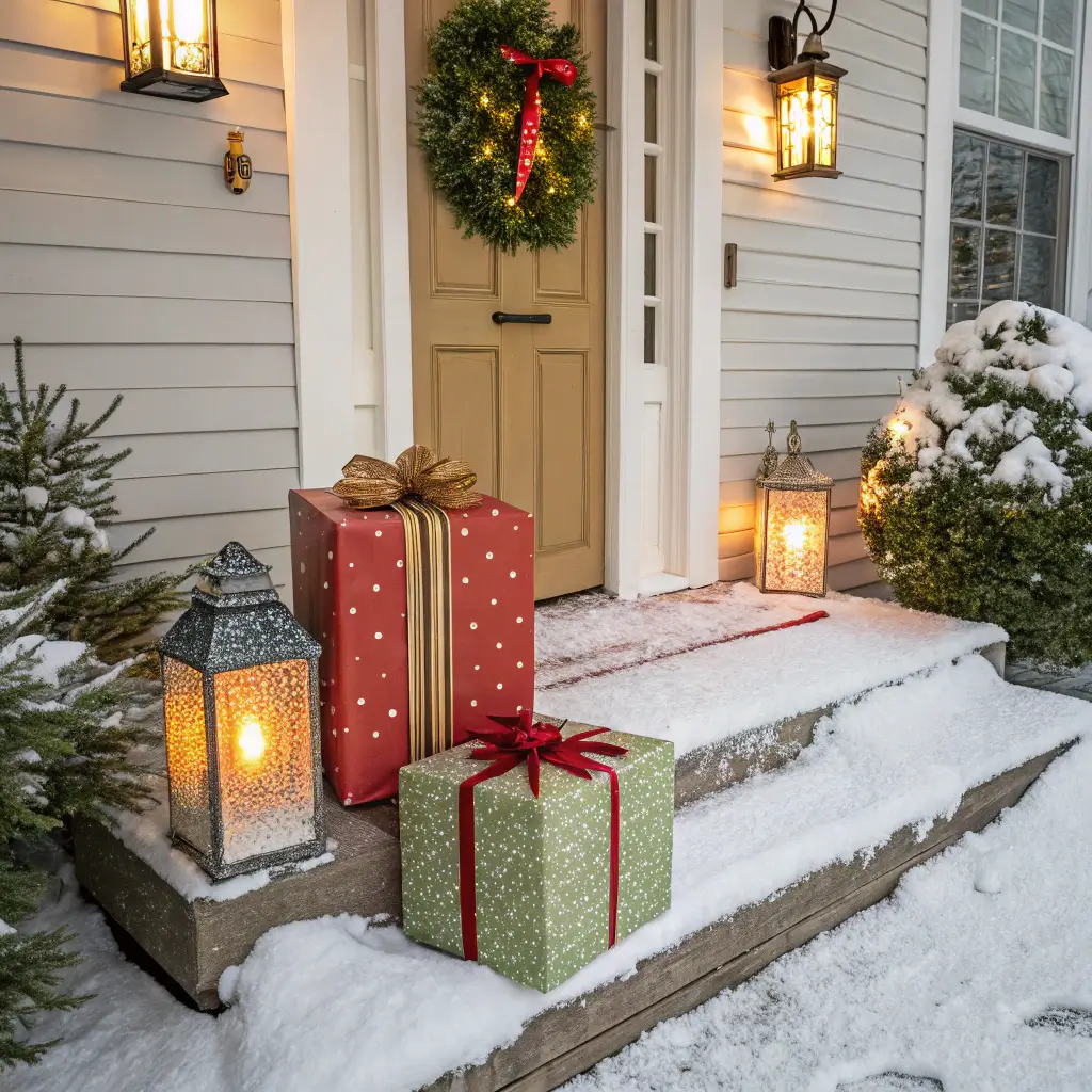 Giant decorative gift boxes flanking your entrance create an inviting, festive atmosphere. These weatherproof beauties cost almost nothing to make but look incredibly impressive.