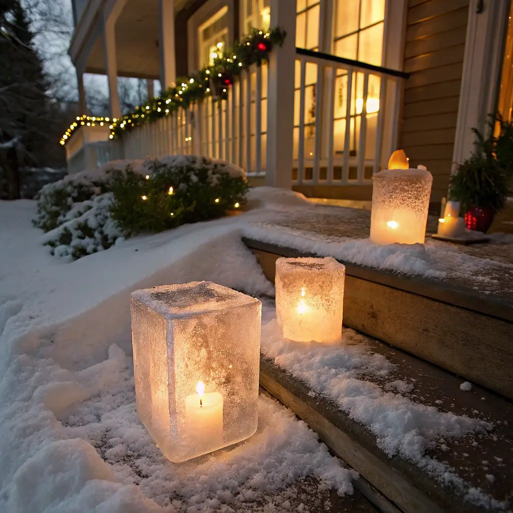 Fill a large balloon or bucket with water, add winter greenery, berries, or even food coloring, then freeze. Once solid, remove the container and hollow out the center for a candle. These natural sculptures catch and reflect light in the most incredible ways.