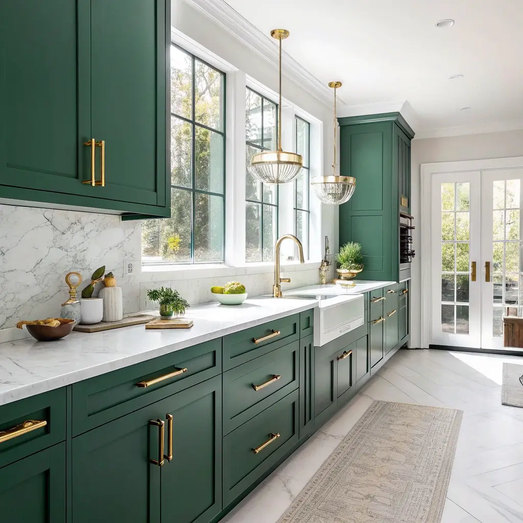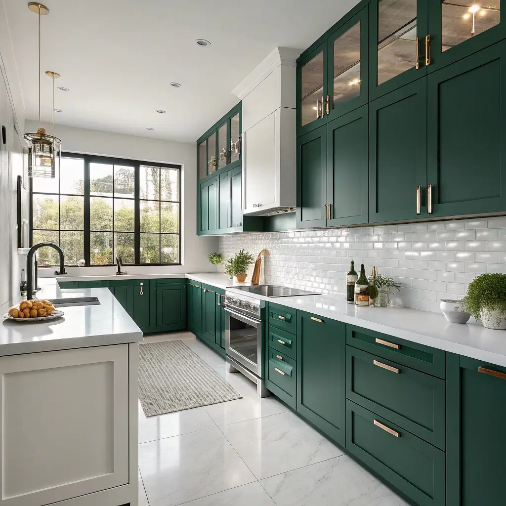 Want to know the secret to making emerald green feel fresh and contemporary? Crisp white countertops create the perfect balance. This combination gives you that clean, modern aesthetic while still allowing the green to be the star of the show.