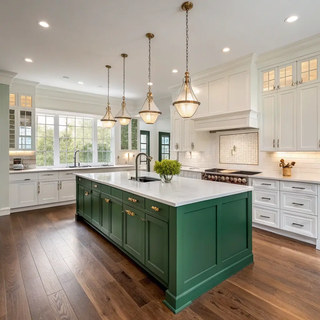 Ever wondered why kitchen islands always seem to steal the show? Because they’re literally the centerpiece of your kitchen! Making your island emerald green while keeping the perimeter cabinets neutral creates this amazing focal point that draws everyone in.