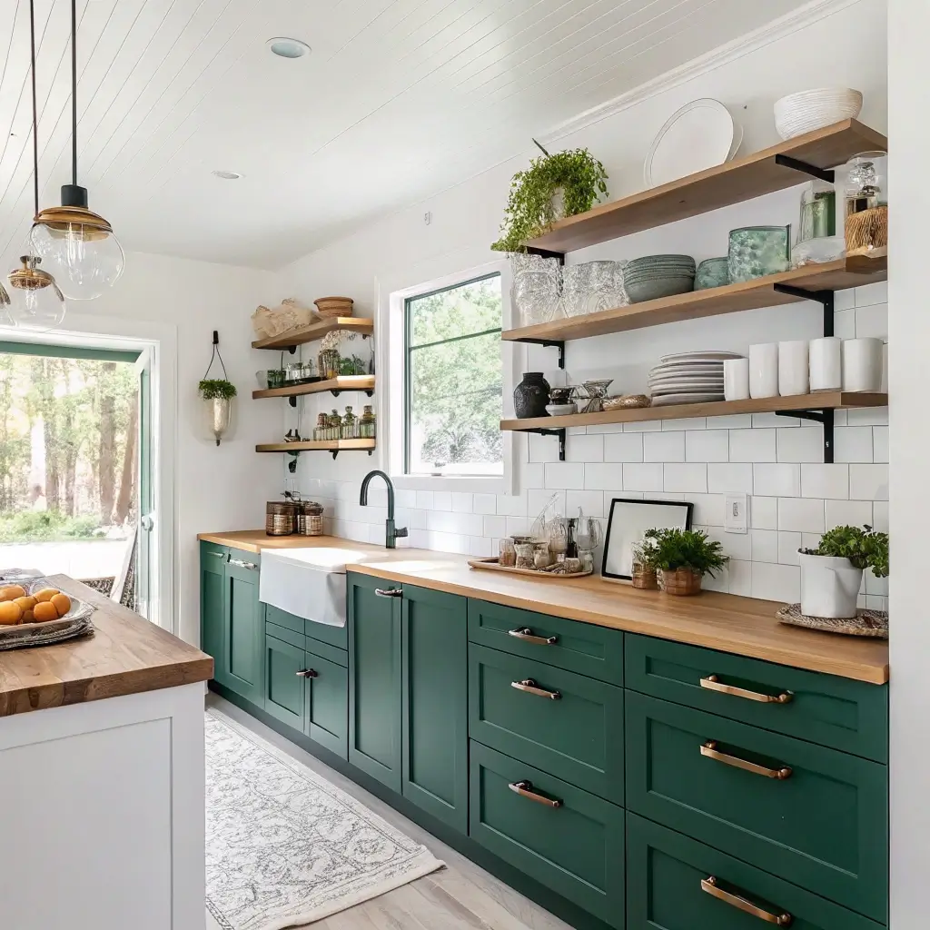 Open shelving and emerald green walls or lower cabinets? Chef’s kiss! This combination gives you the best of both worlds—bold color and visual breathing room. The open shelves prevent the emerald from feeling too heavy while giving you space to display your prettiest dishes.