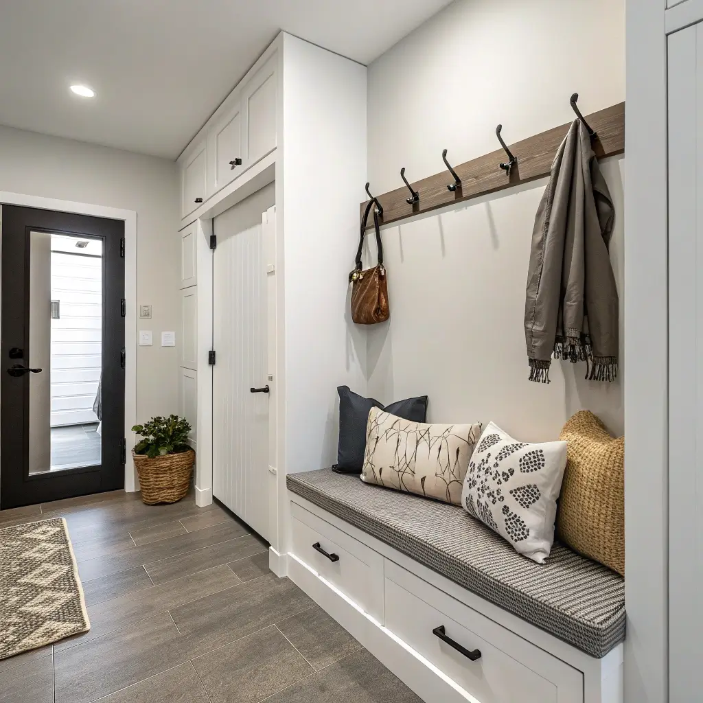 Build storage into your bench design. Hidden compartments inside hold seasonal items. Hooks underneath keep bags organized. Add a cushion in weather-resistant fabric for comfort that handles daily use.