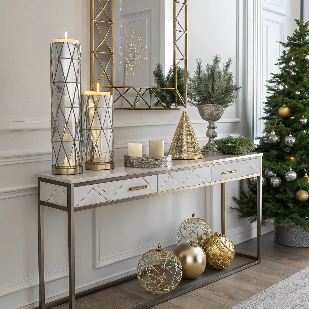 Modern Metallic Holiday Entry Table Setup
