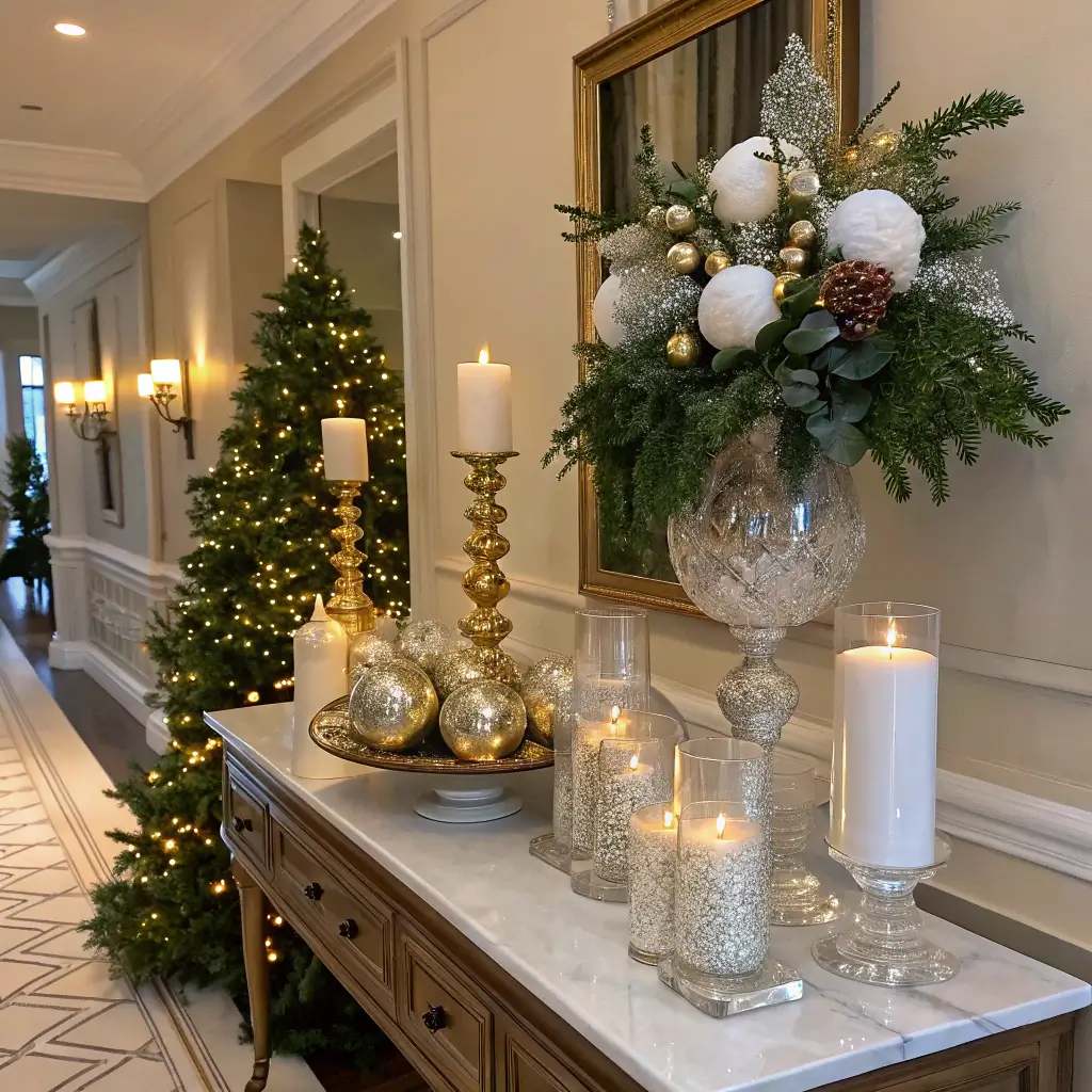 Want your entry to feel like a fancy hotel lobby during the holidays? Crystal and candles create this upscale ambiance that makes everyone feel special walking into your home. This style says “adult Christmas party” rather than “family gathering.”