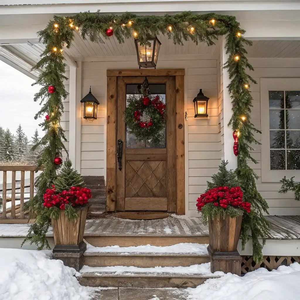 Place lanterns of varying heights along your porch steps. Fill them with ornaments, pine sprigs, or battery candles. The key here? Odd numbers look more natural – go with three or five lanterns rather than four.