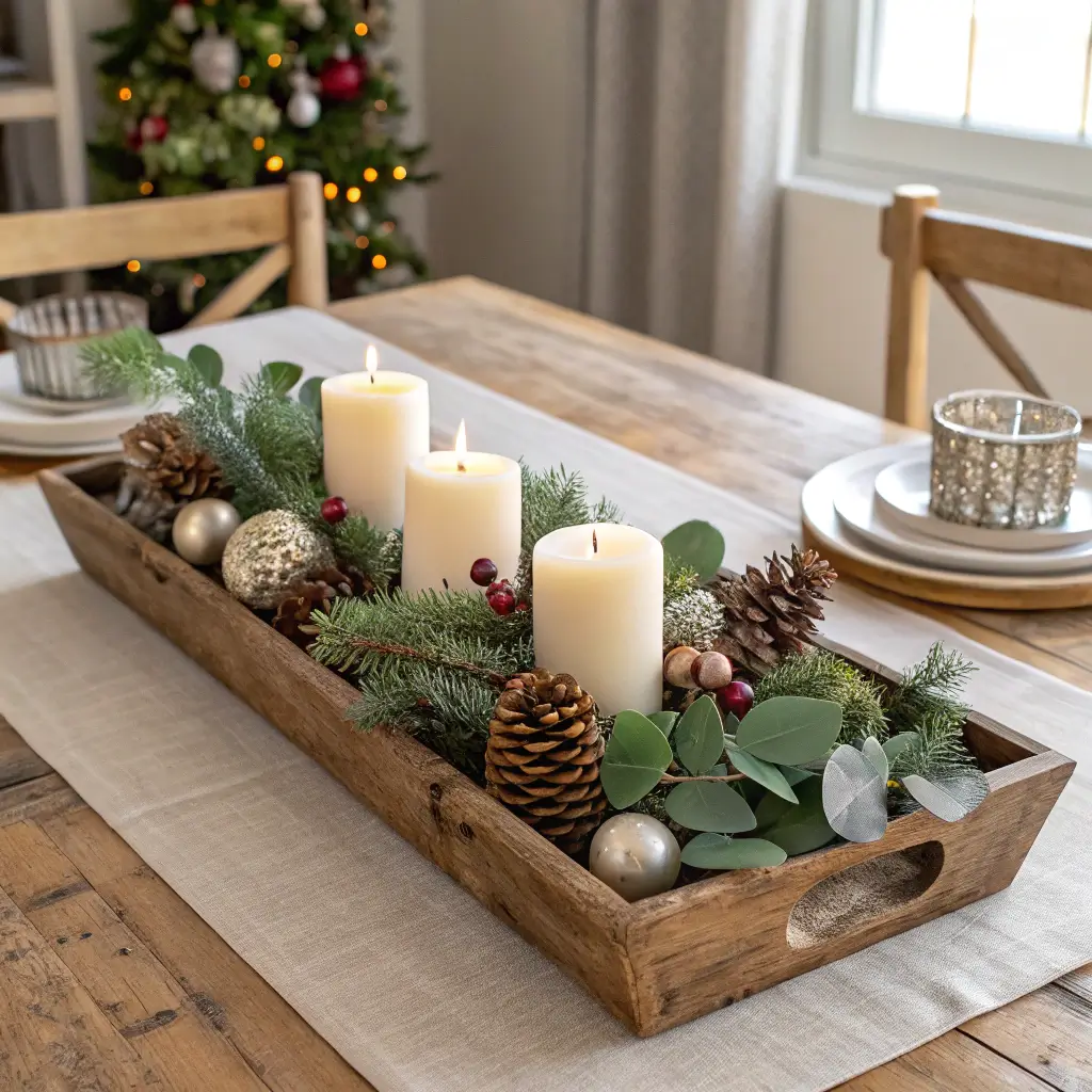 Want something more unique? Transform an old wooden toolbox into a stunning centerpiece. Fill compartments with different elements – ornaments in one, pinecones in another, maybe some cinnamon sticks tied with ribbon. The built-in handle makes it easy to move when you need the table space.