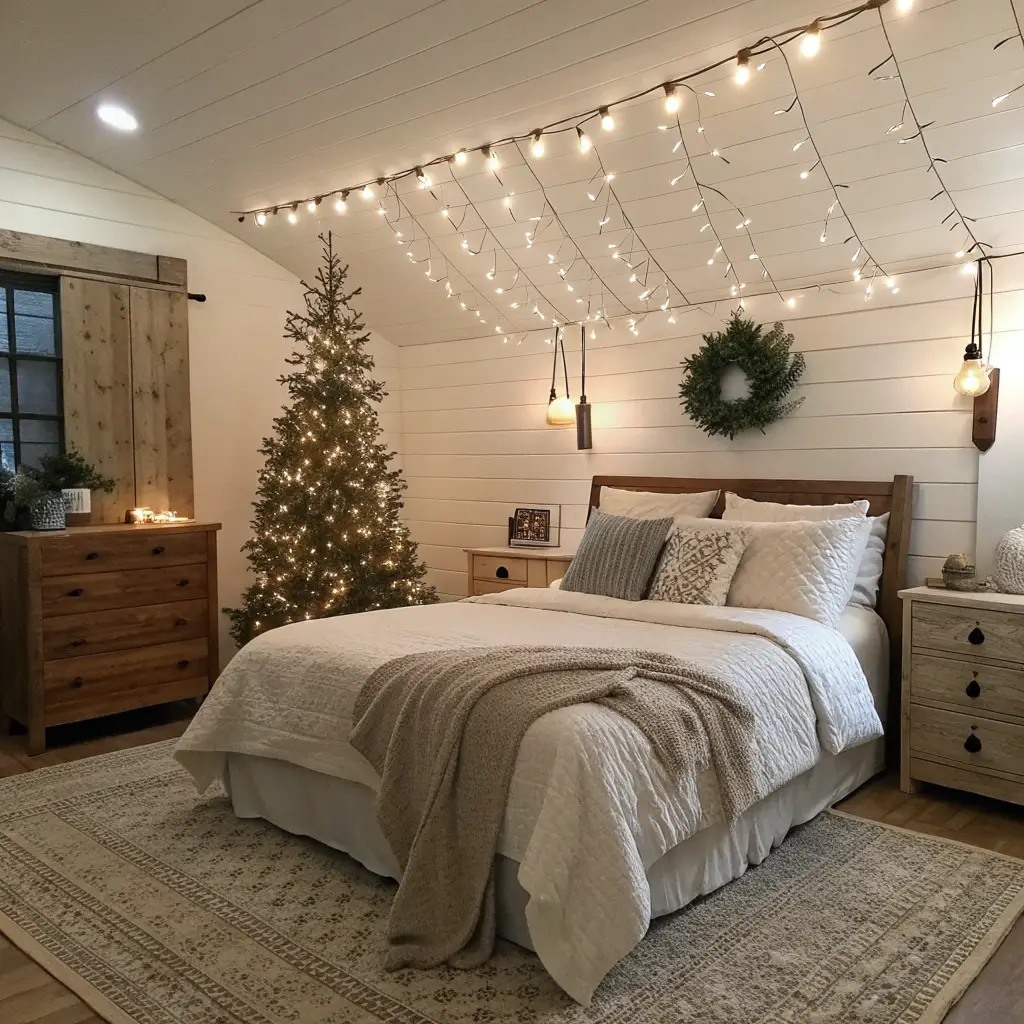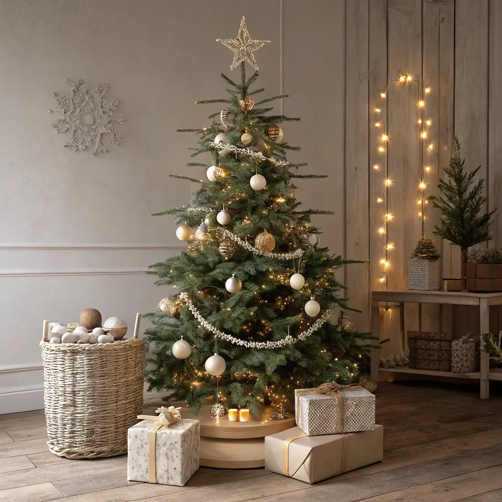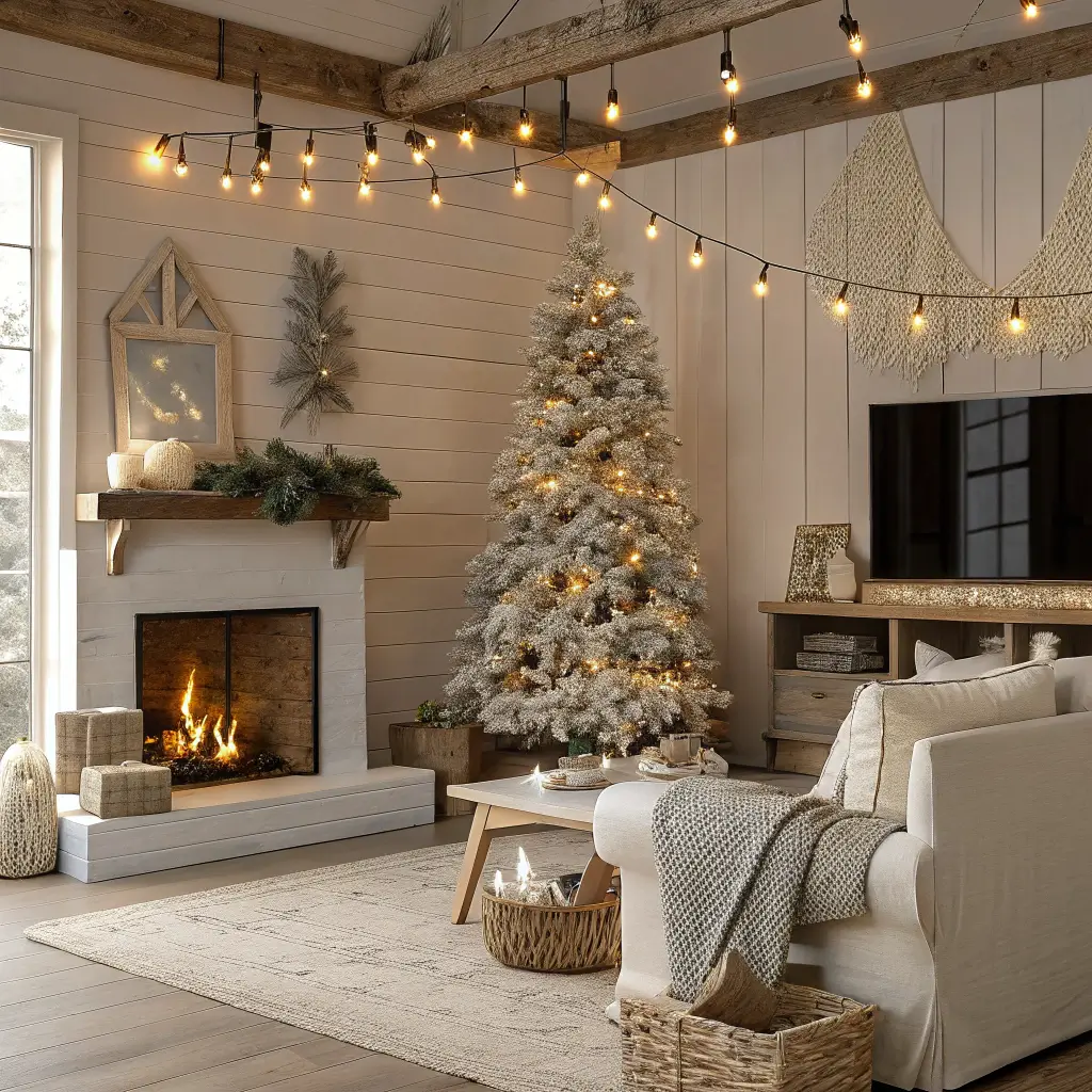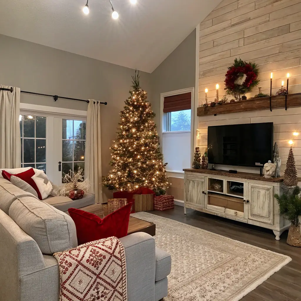 Choose a simple color palette – whites, creams, and natural wood tones with maybe one accent color like sage green or dusty blue. Skip the tinsel entirely. Instead, wrap your tree with simple white lights and burlap ribbon as garland. The ribbon trick saves money and looks intentionally rustic.