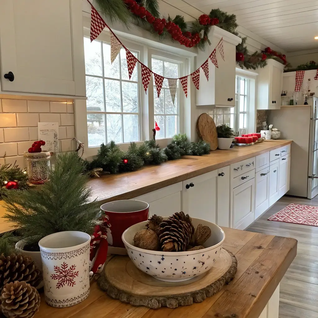 Transform your open shelving or glass cabinets into display areas. Mix everyday dishes with holiday pieces, add some greenery sprigs, and maybe tuck in some vintage ornaments. The trick? Keep it functional – you still need to cook, after all!