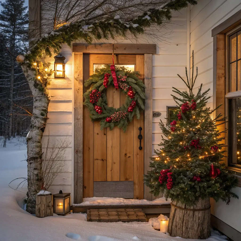 Start with your door – a oversized grapevine wreath adorned with pine branches, berries, and maybe some vintage ornaments sets the tone. But here’s where most people stop. Don’t be most people! Flank your door with galvanized buckets or old milk cans filled with birch logs, pine branches, and battery-operated lights.