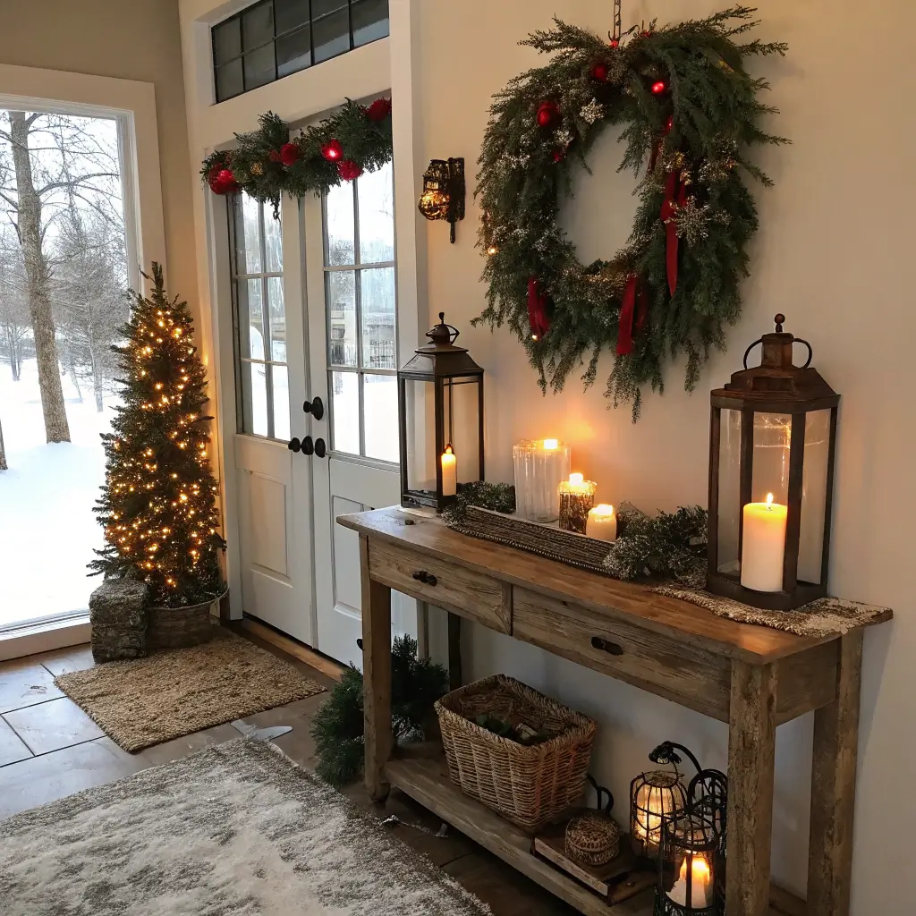 Here’s my secret weapon: asymmetrical arrangements. Instead of matching everything perfectly on both sides, create visual weight that’s balanced but not identical. Maybe three lanterns on one side, balanced by a tall vintage sled on the other. Your eye stays interested instead of glazing over.