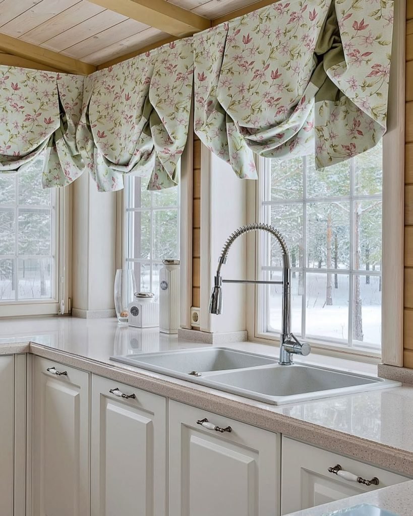townandcountryliving nailed this look with their floral balloon valances. The pattern is gentle, not busy, and the pale pink and green tones blend beautifully with the crisp white cabinetry. Notice how the valances hang just low enough to add interest but high enough to keep the view clear. That’s the sweet spot.
