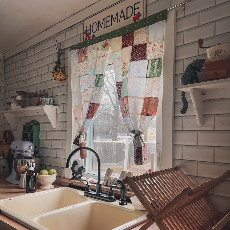 daughtersandthings proves that farmhouse style doesn’t have to be matchy-matchy. Their patchwork curtains pull together florals, solids, and prints in soft pinks, greens, and browns. The subway tile backsplash keeps things grounded, while vintage touches like the dried flowers and antique tools add personality. This is the kind of kitchen that feels lived in, not staged.