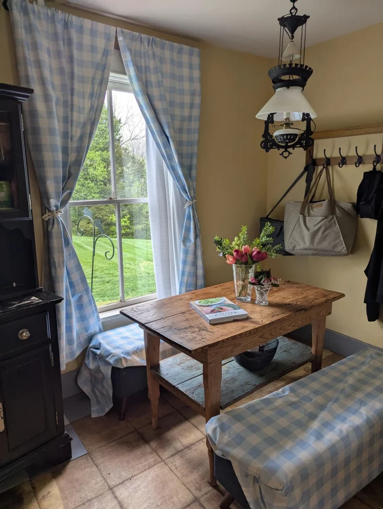 [PLACEHOLDER – Add username here] styled their breakfast nook with full-length blue-and-white gingham curtains, and it looks like something out of a farmhouse dream. The curtains frame the window beautifully and add a soft, romantic touch to the space. The matching gingham bench cushion ties everything together, while the rustic wooden table and vintage lantern-style light fixture keep the look grounded and authentic.