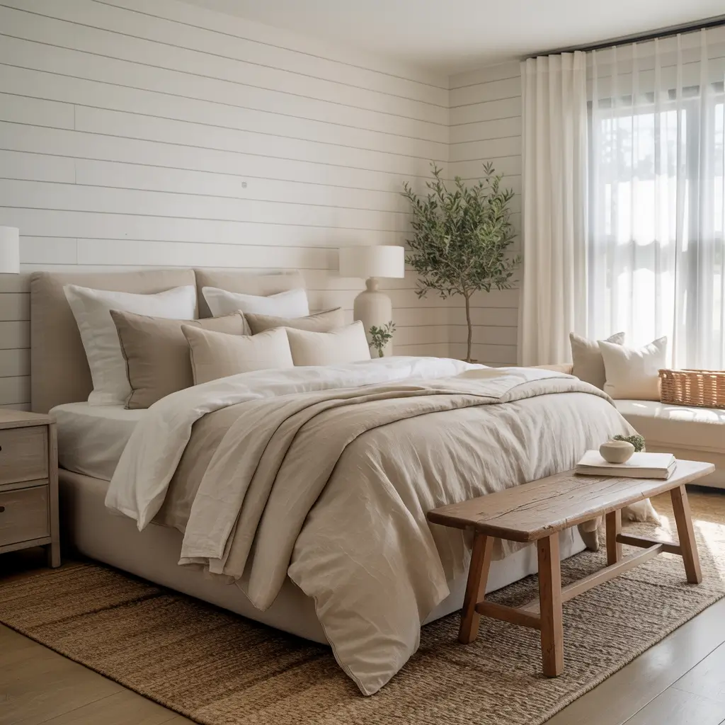 Start with your largest pieces and work down. Grasscloth wallpaper or textured paint on walls. A jute or sisal rug grounding the space. Linen curtains filtering light beautifully.