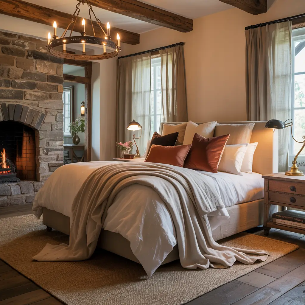 Mix materials thoughtfully. A metal bed frame with a reclaimed wood headboard. Industrial pendant lights over rustic nightstands. Exposed brick wall softened with flowing curtains. The tension between styles creates the magic.