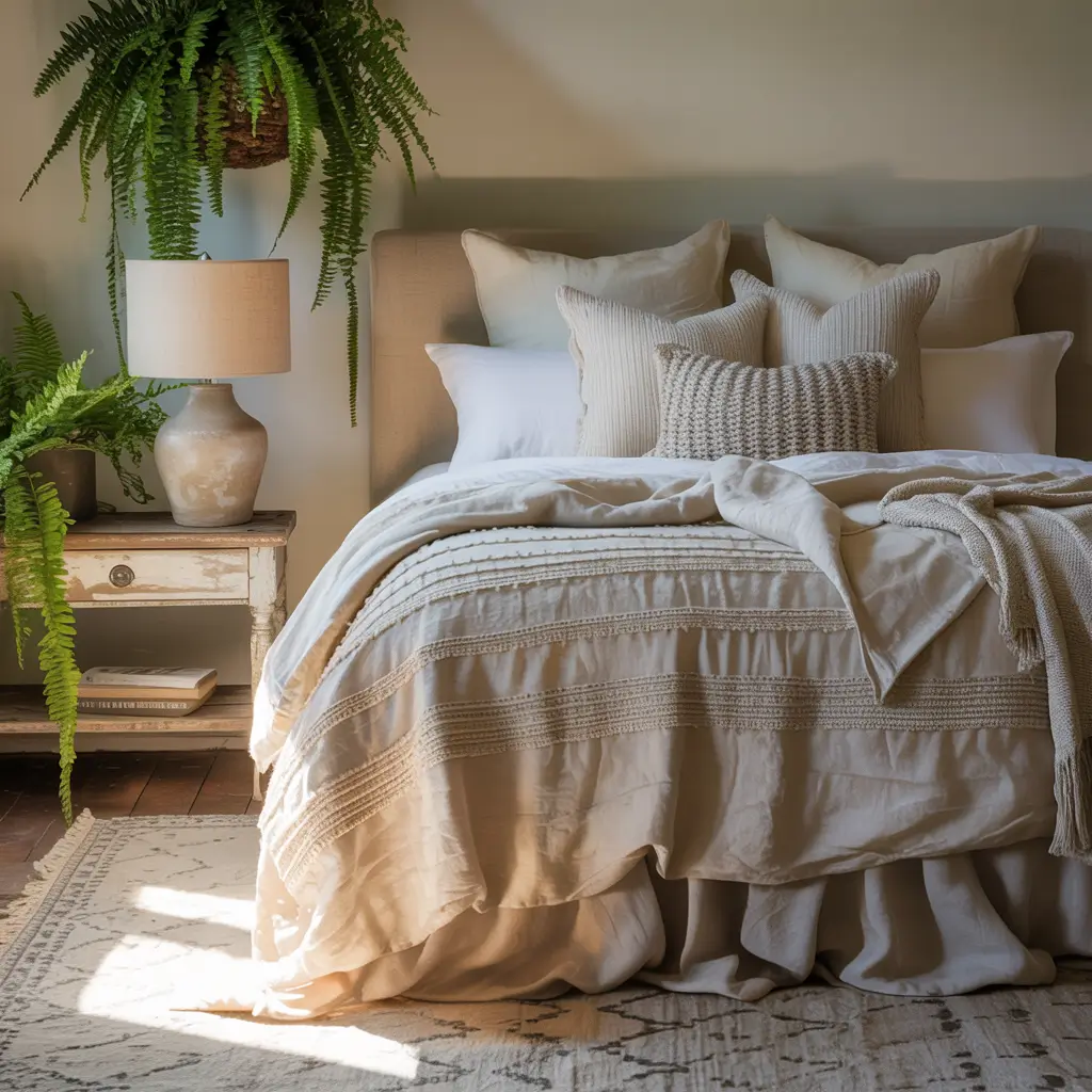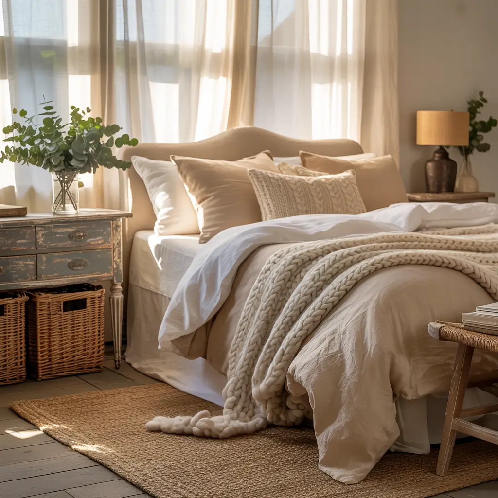 Natural textures are the secret sauce of farmhouse design. We’re talking jute, linen, cotton, wool, wood, stone – basically, if it came from nature, it belongs in your farmhouse bedroom.