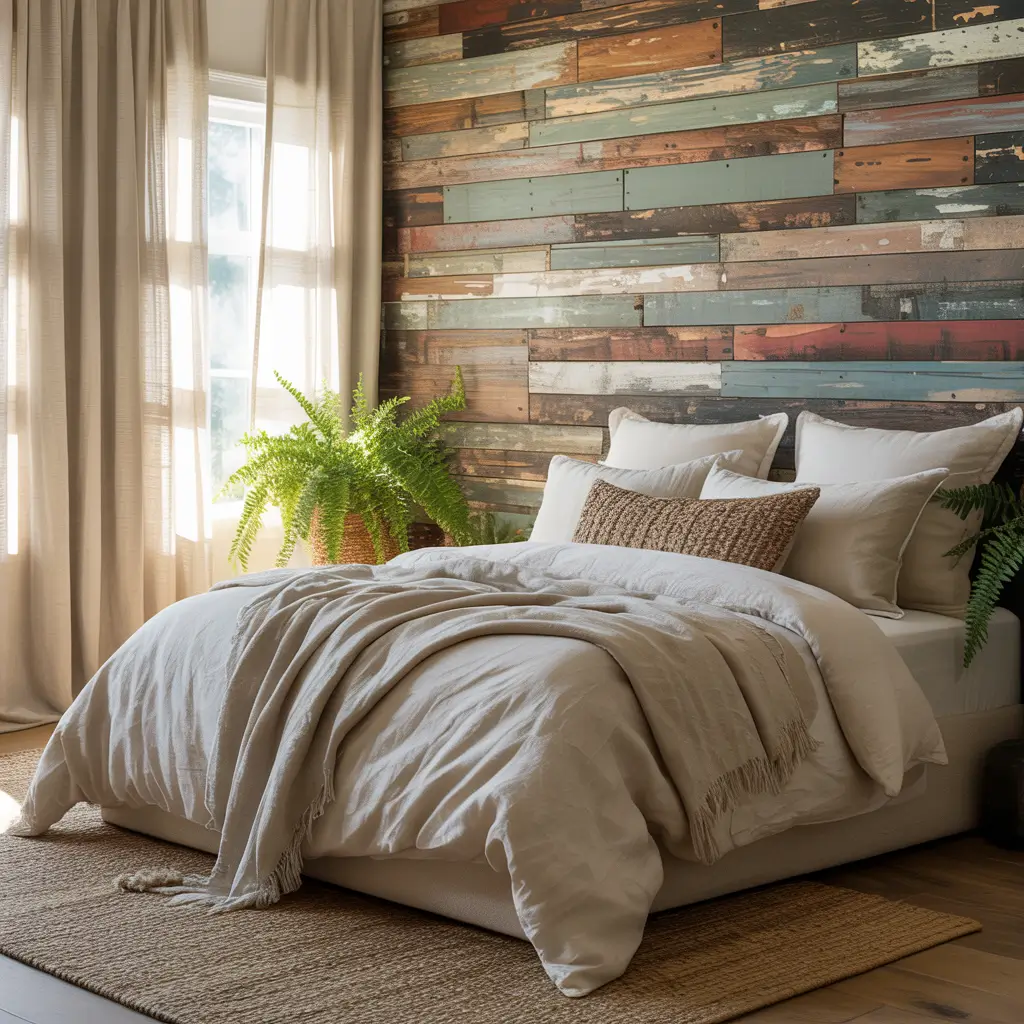 Consider adding matching wooden elements throughout the room. A reclaimed wood headboard or rustic nightstands tie everything together beautifully.
