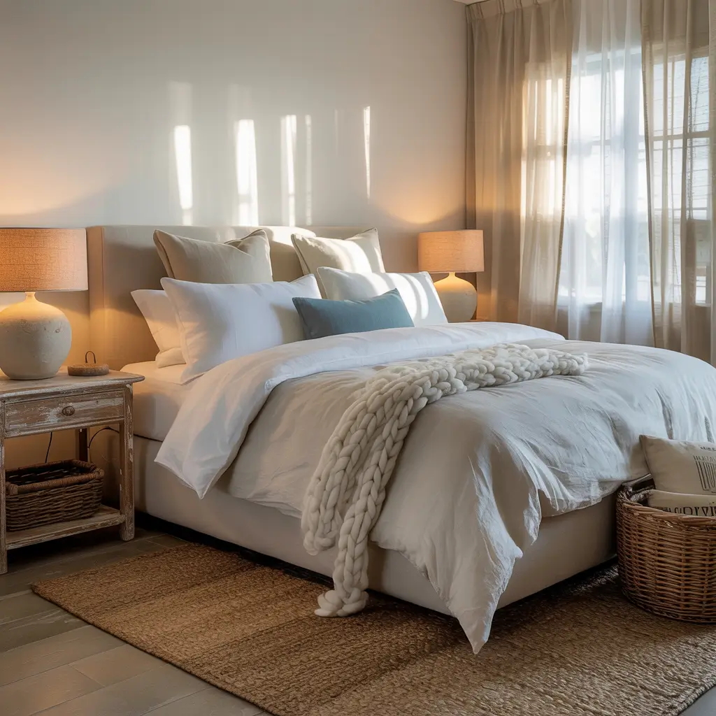 Start with a light, airy color palette. Soft whites, pale blues, sandy beiges. Add weathered or white-washed wood furniture for that sun-bleached look. Natural fiber rugs in jute or sisal ground the space perfectly.