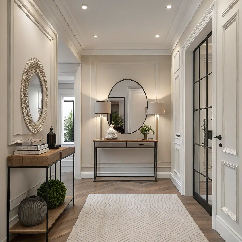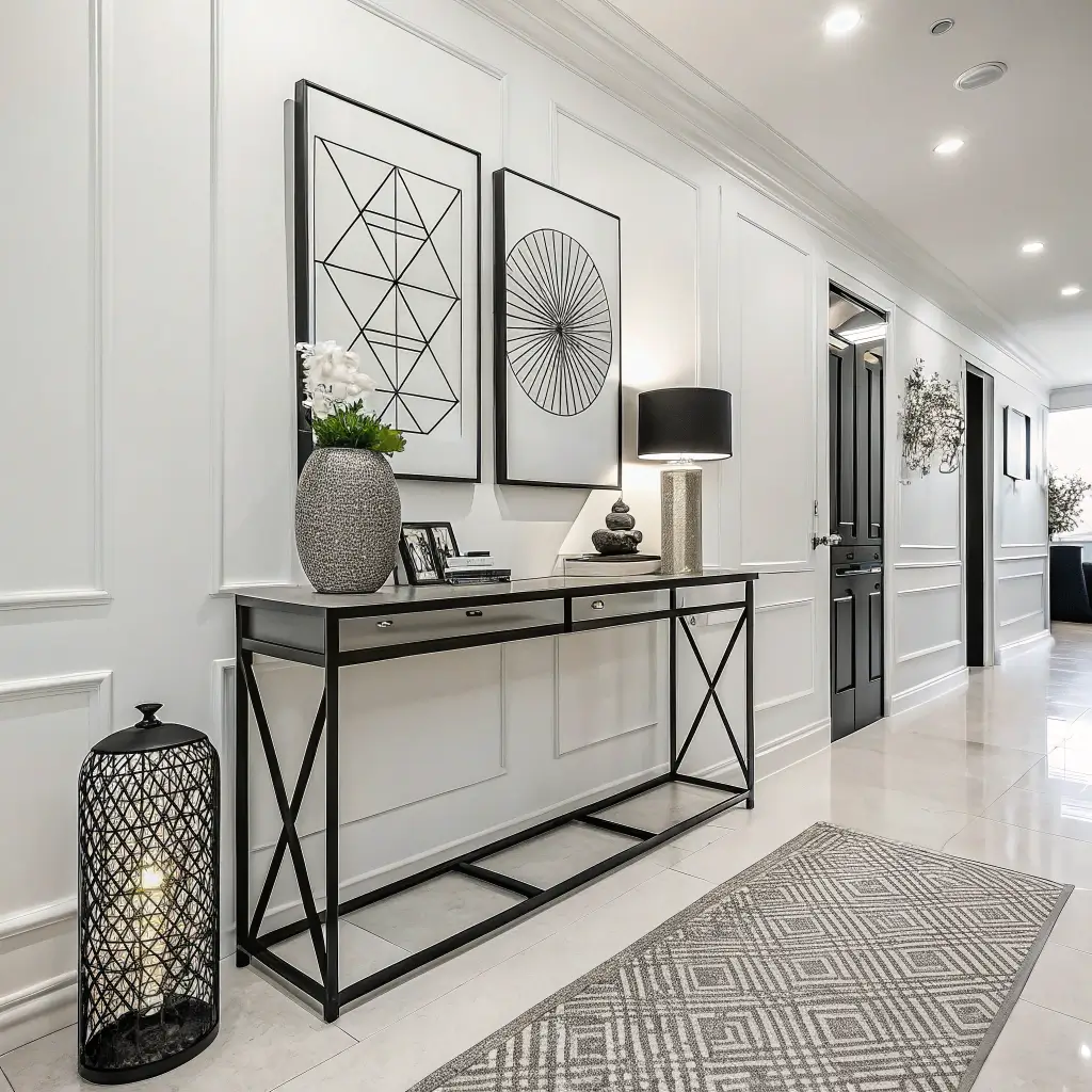 Start with a sleek console table – nothing fancy, just clean lines and a simple design. Mount a single floating shelf above it for keys and mail. The magic happens when you add just one statement piece, like a bold abstract painting or a sculptural vase.