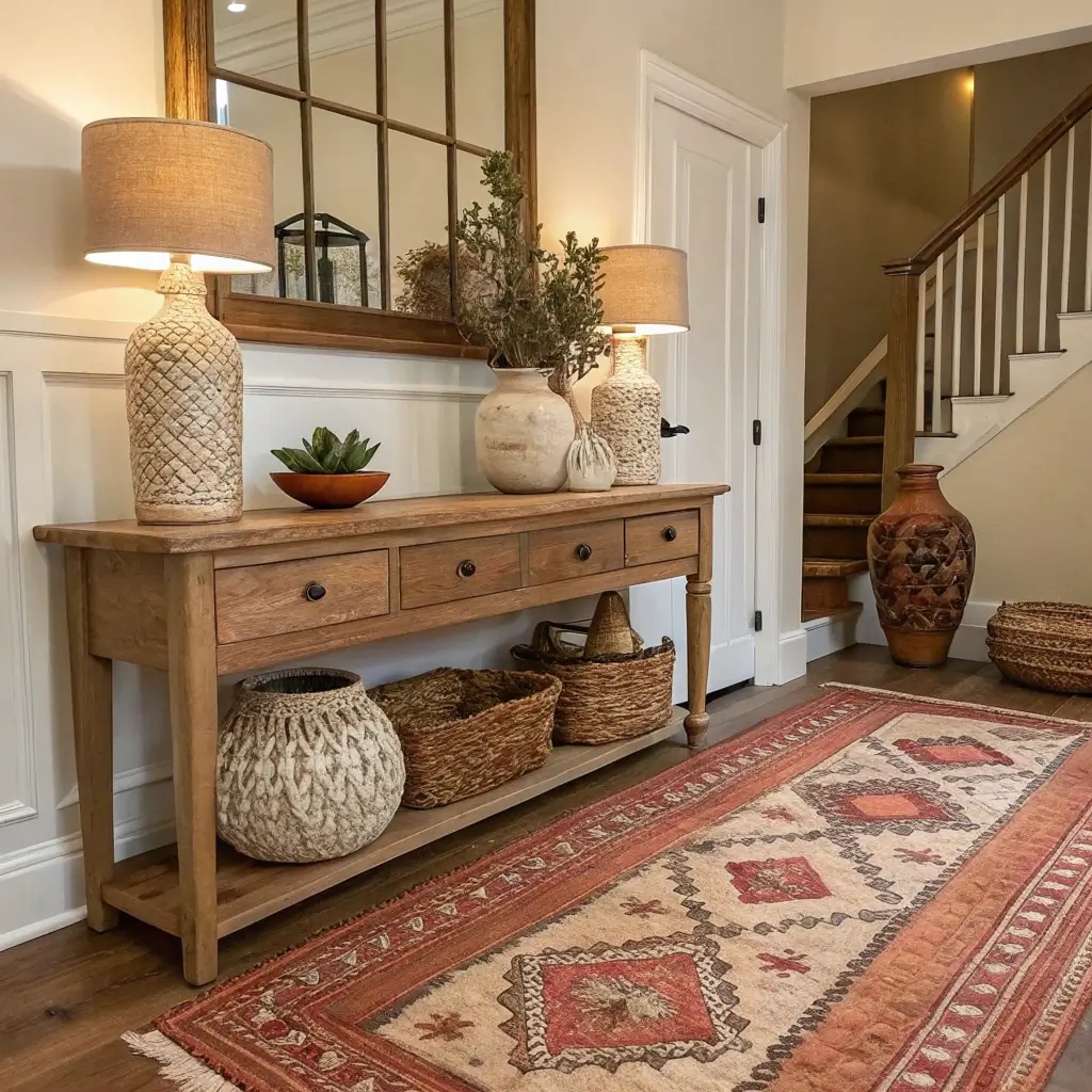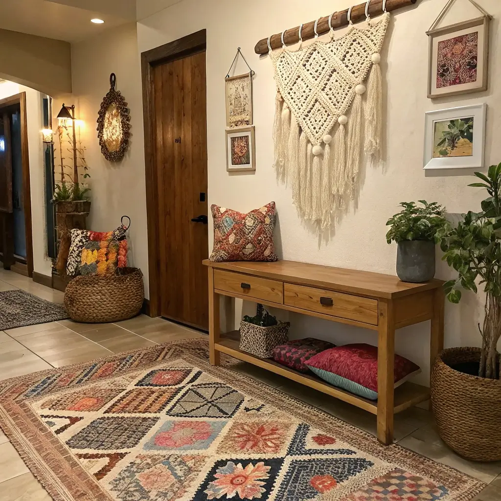 Boho style gives you permission to break all those matchy-matchy rules. Layer patterns, mix textures, and embrace color in ways that would make minimalists nervous. The result? An entryway that feels collected over time rather than purchased in one shopping spree.