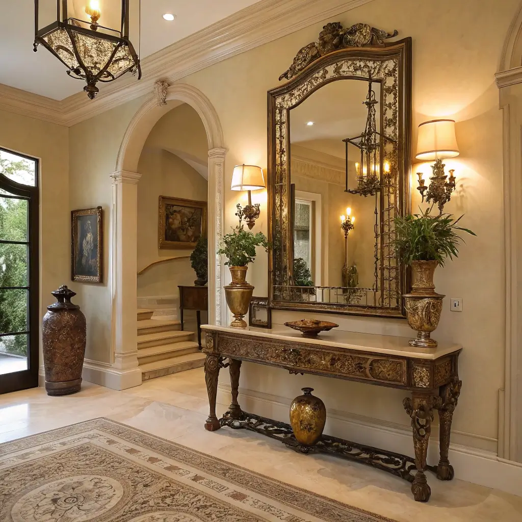 Strategic mirror placement can transform a dark entryway into a bright, welcoming space. Multiple mirrors create an almost magical effect, bouncing light around like a sophisticated fun house.
