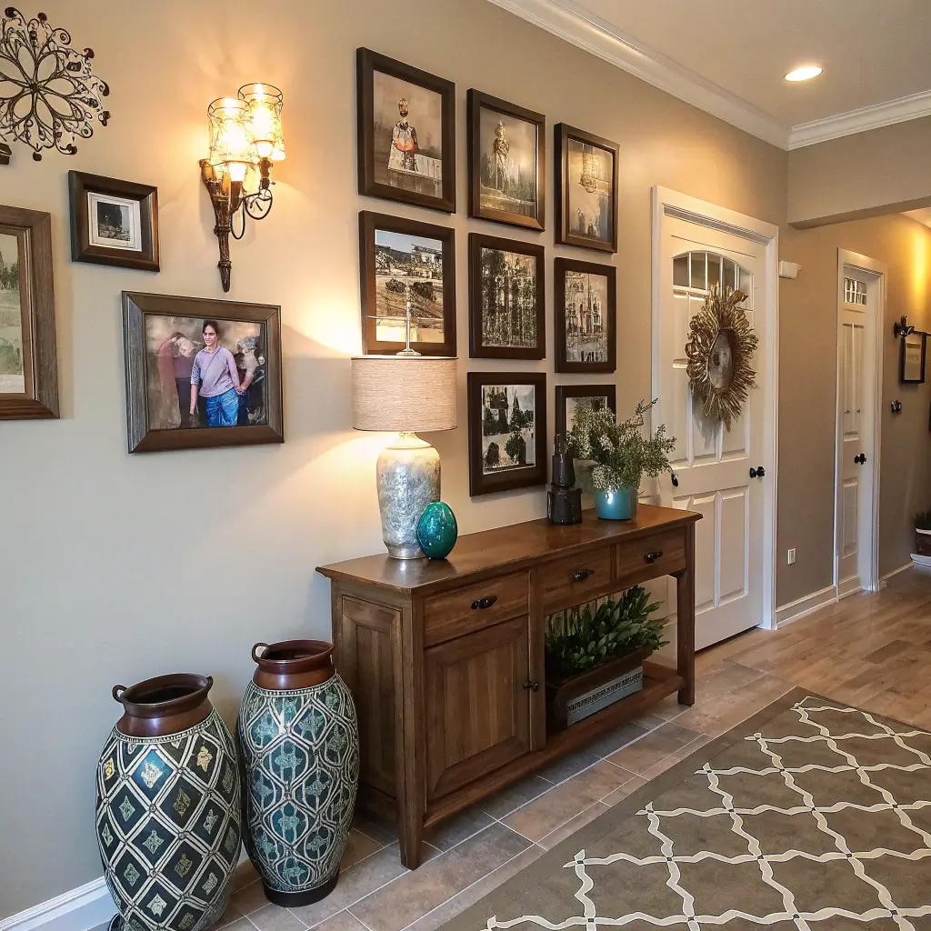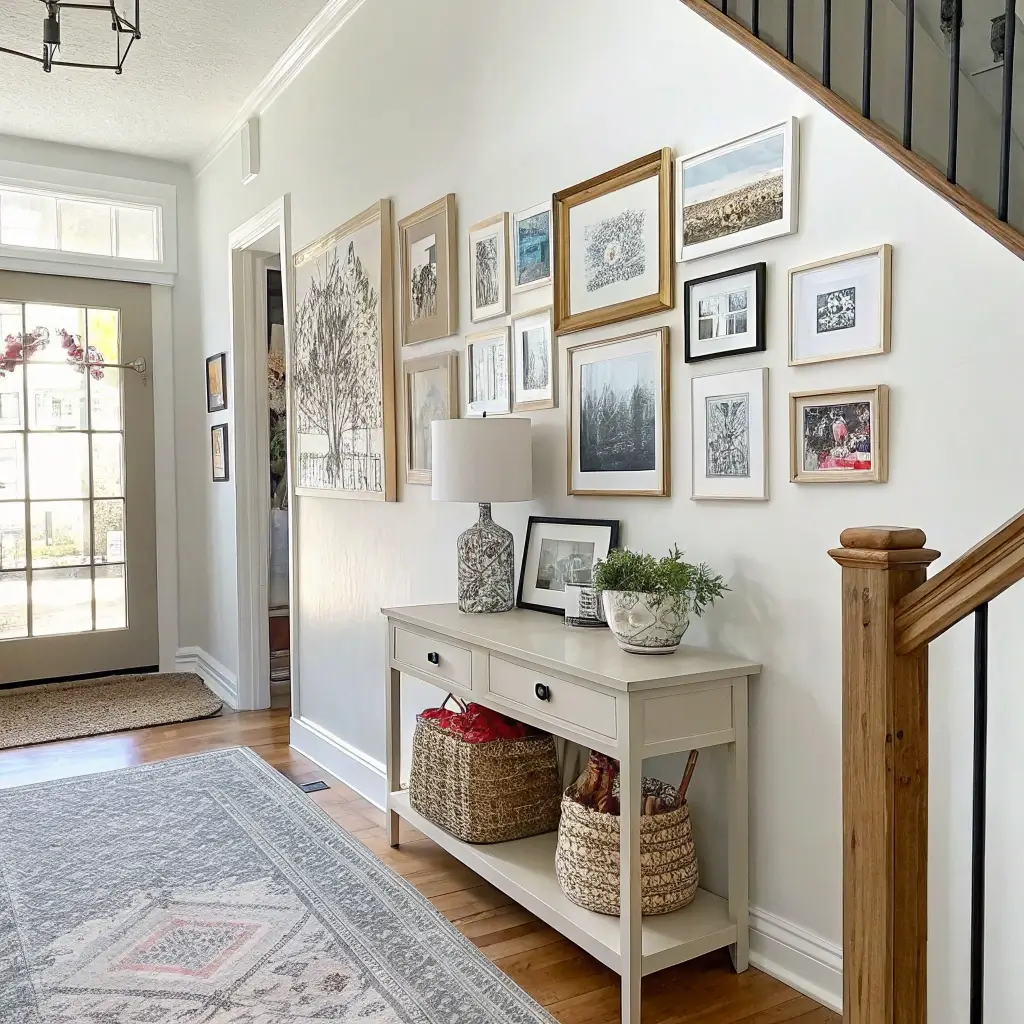 Creating a gallery wall in your entryway lets you showcase your personality before guests even enter your living room. Mix family photos, artwork, and meaningful quotes for a display that’s uniquely yours.