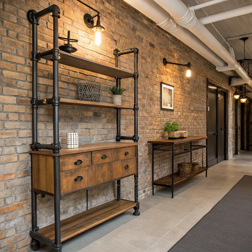 Industrial style brings function and edge to your entryway. Pipe shelving systems offer customizable storage that looks intentionally cool rather than purely practical.
