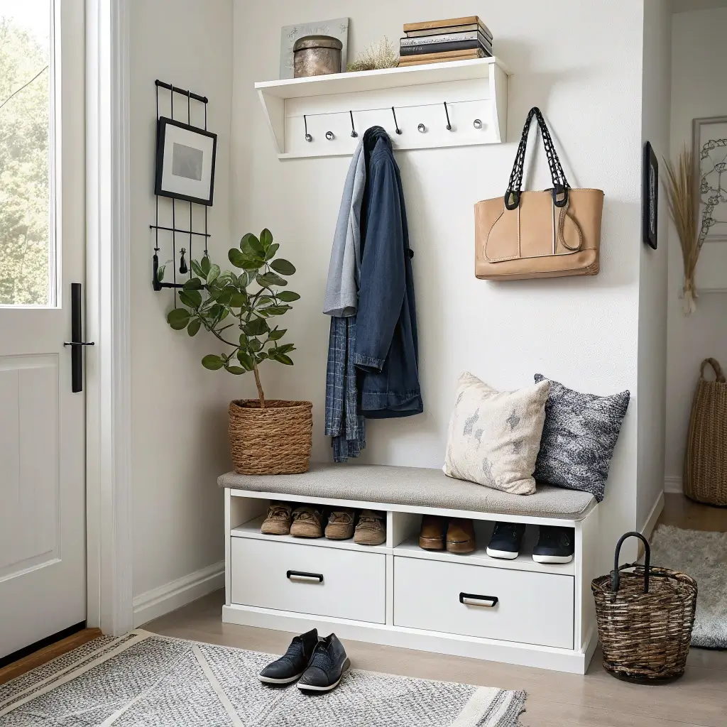 Built-in cubbies work miracles in small spaces. If built-ins aren’t possible, a slim shoe cabinet that doubles as a console table kills two birds with one stylish stone. My IKEA hack turned a basic shoe cabinet into a custom-looking piece with just new hardware and paint.