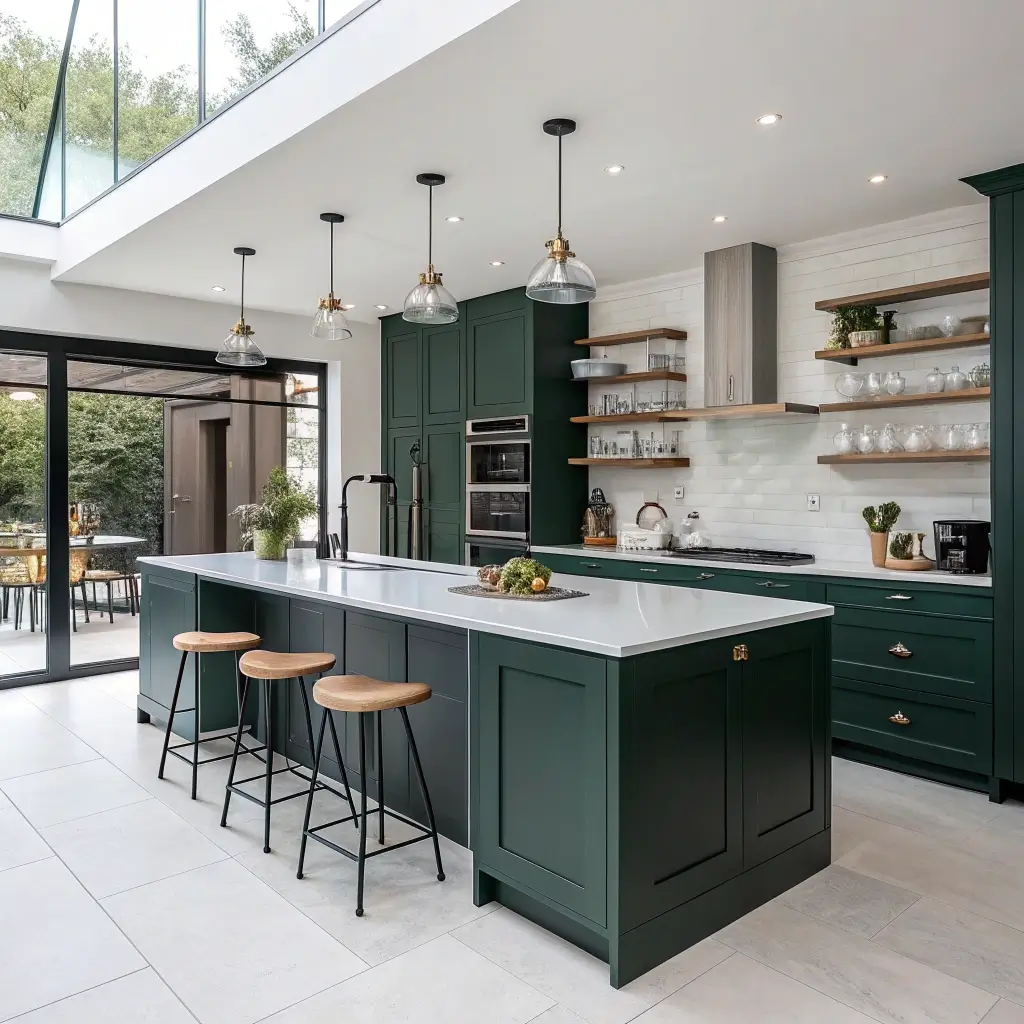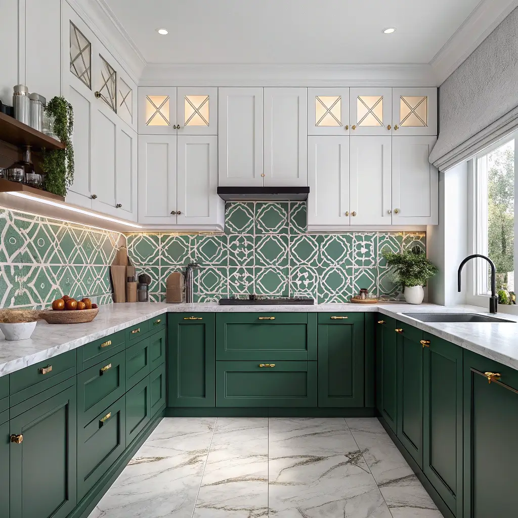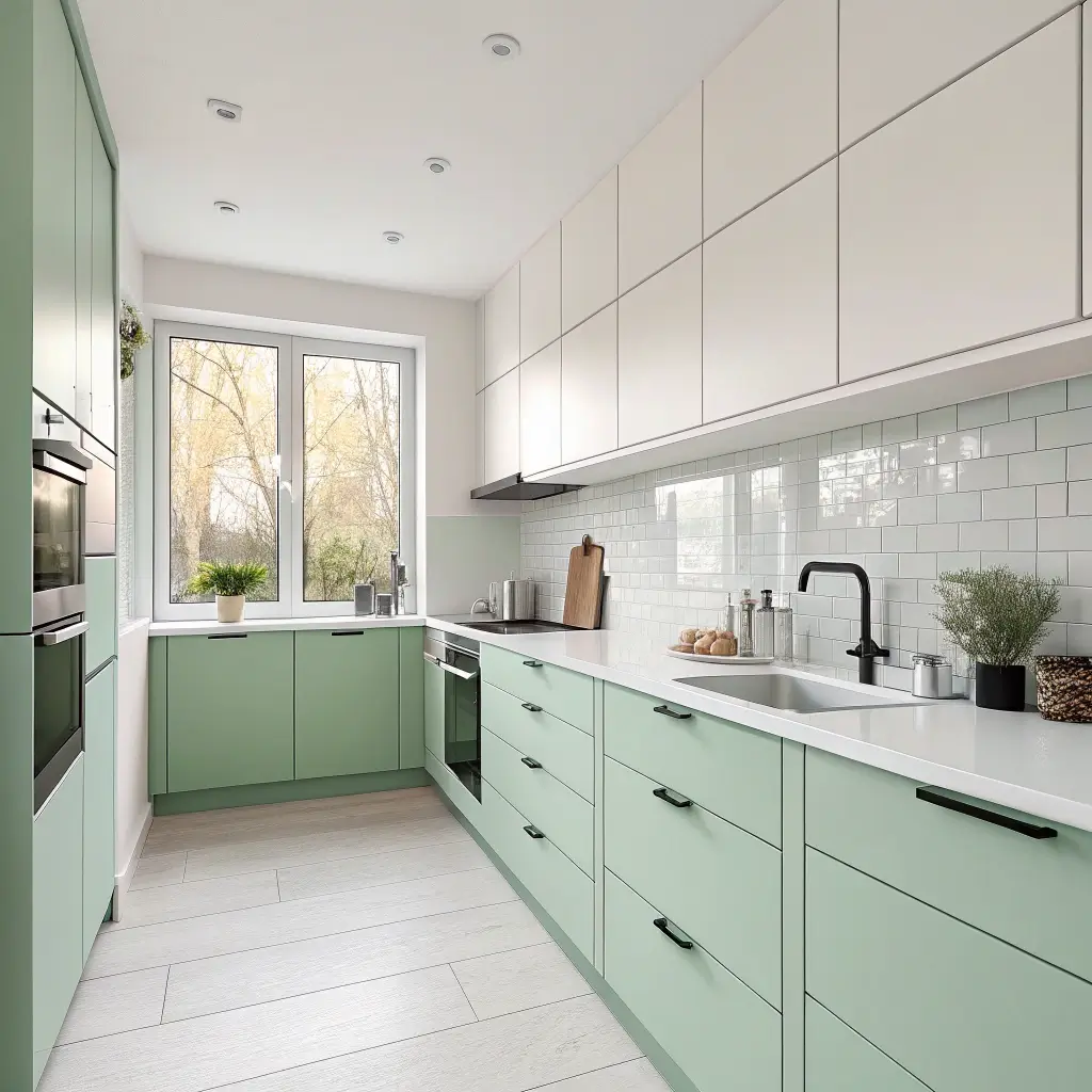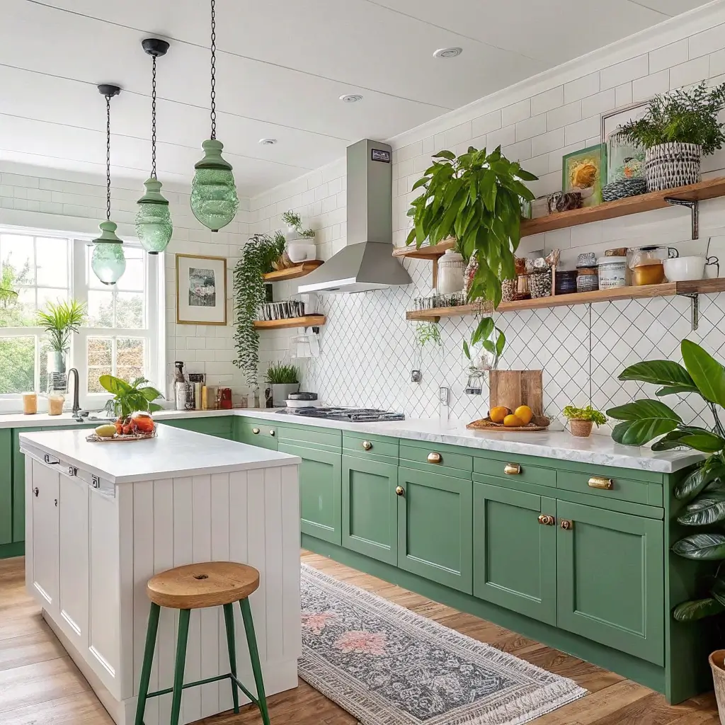 Consider your existing elements too. Got stainless steel appliances? Perfect – they play beautifully with green and white. Stuck with black appliances? Even better – they add sophistication to the palette.