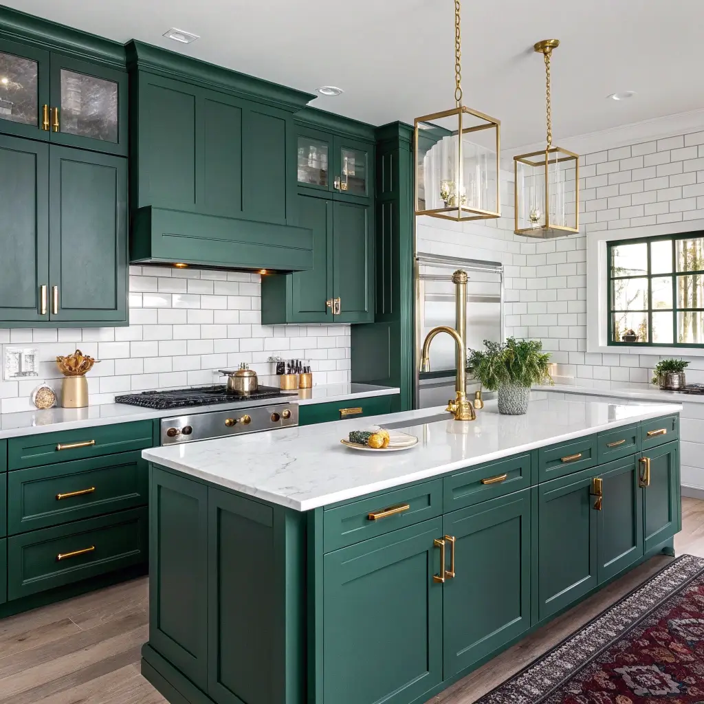 Bold Green Cabinets with White Accents