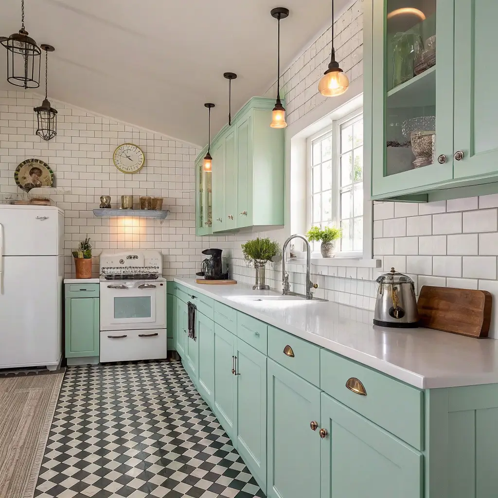 Vintage kitchens with green and white color schemes take me straight back to my grandmother’s house – in the best possible way. There’s something deeply comforting about mint green appliances and checkered floors.