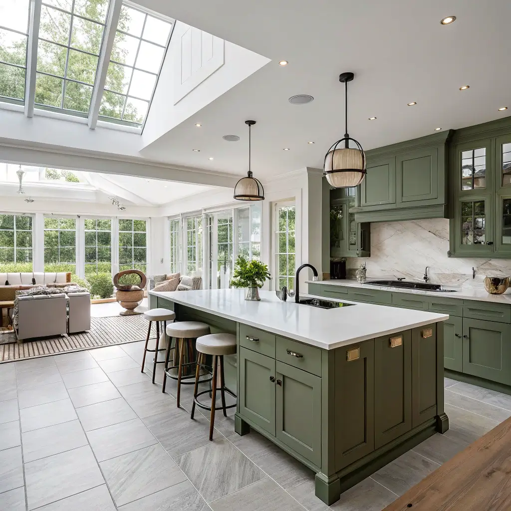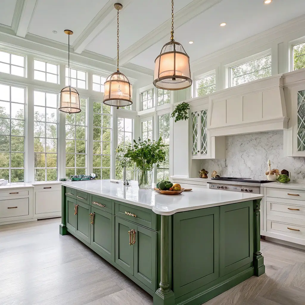 Layer your lighting like you’re creating a stage set. Ambient lighting from recessed cans or flush mounts provides general illumination. Task lighting under cabinets makes prep work easier. Accent lighting highlights your green and white features.
