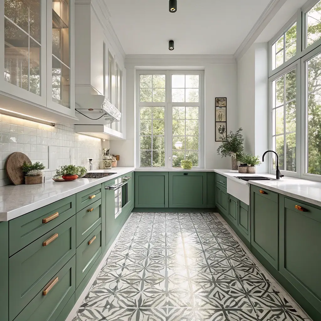 Cement tiles in geometric green and white patterns create instant wow factor. I installed them in a client’s kitchen last year, and honestly? They steal the show. Everything else in the room plays supporting role to those floors.